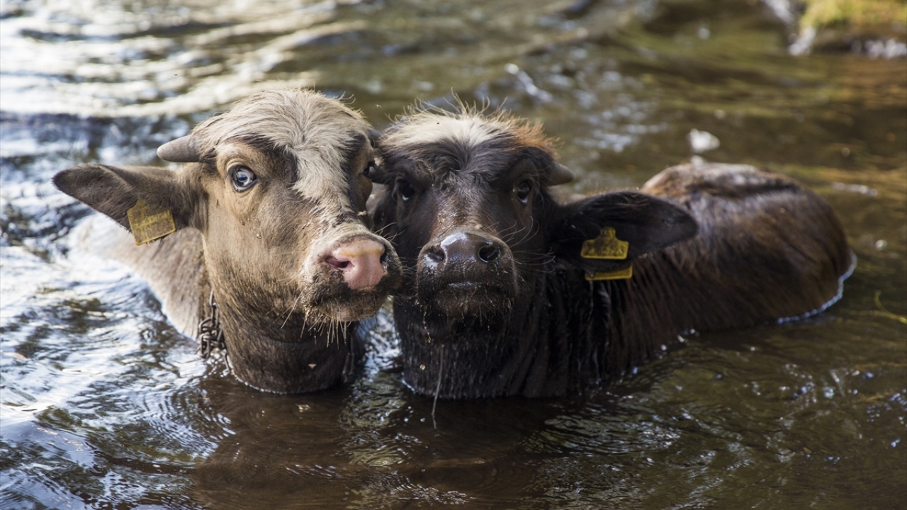 Sulak alanda yüzen mandalar, günün yorgunluğunu burada atıyor, temizleniyor.