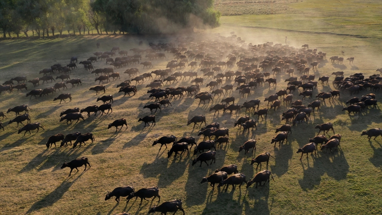 Güneş batmadan önce Dokuzpınar Mahallesi`ne dönmek için yola çıkan manda sürüsü, köydeki sulak alanda gün sonu banyosuna giriyor.