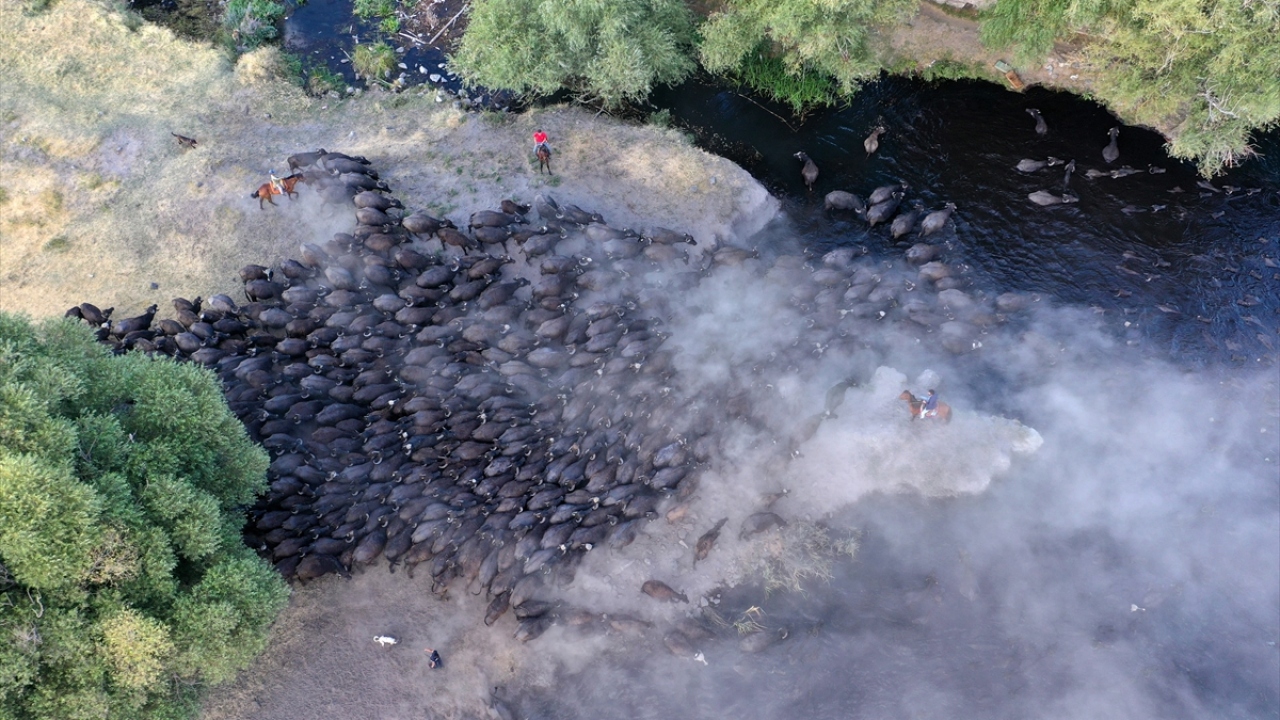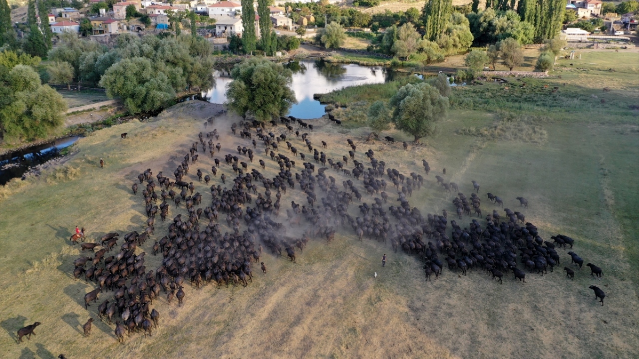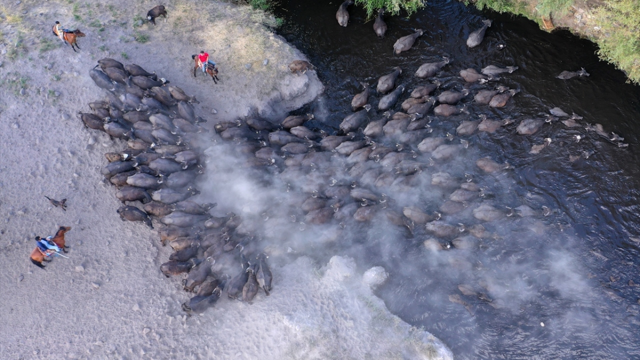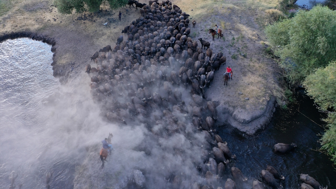 Kayseri'de Hürmetçi Sazlığı'nda yayılan ve sayıları 5 bini bulan mandaların, günün sonunda ferahlamak için girdikleri sudaki görüntüleri görsel şölen sunuyor.