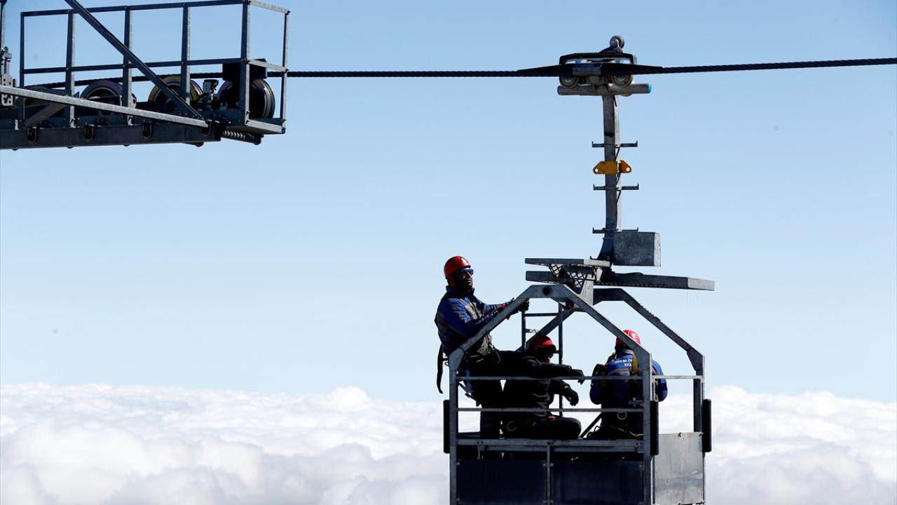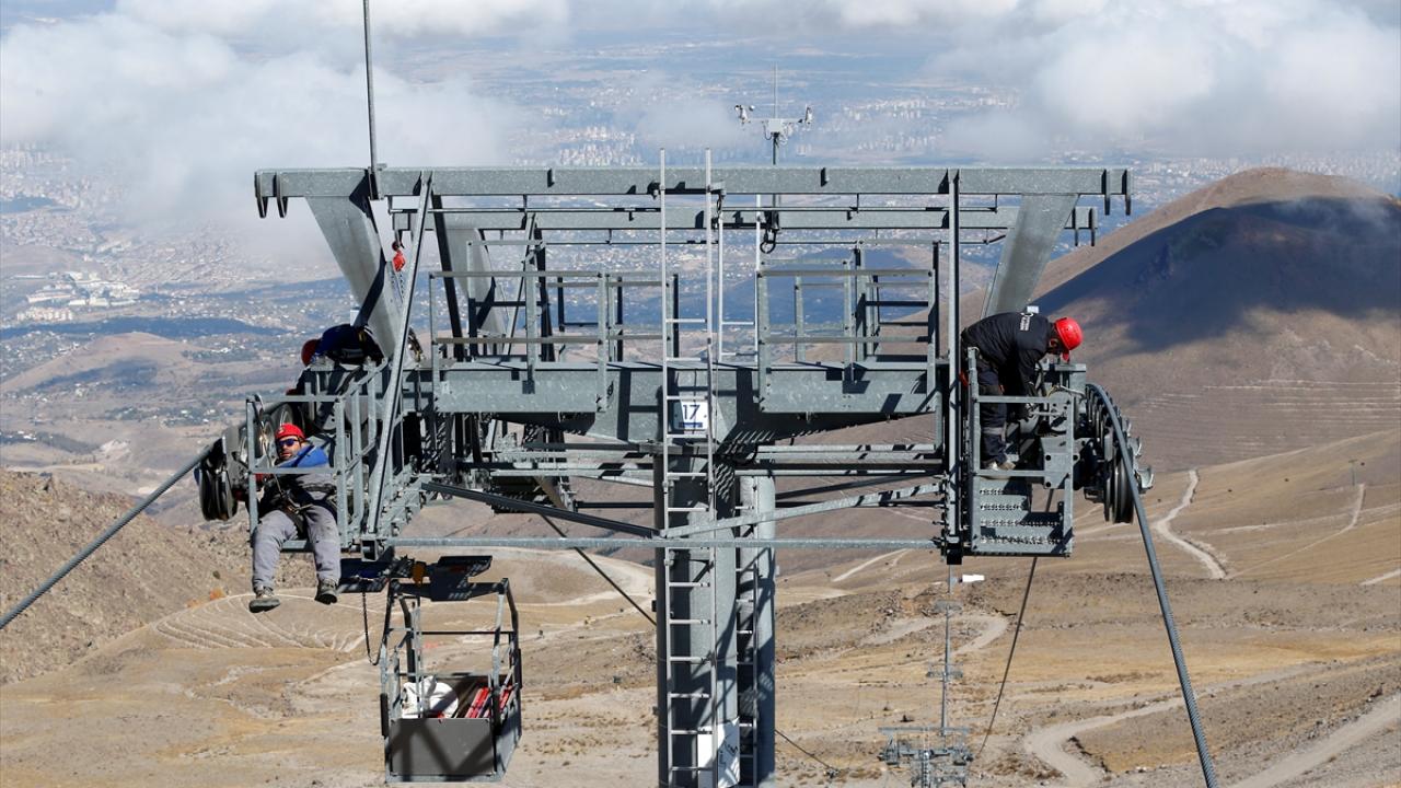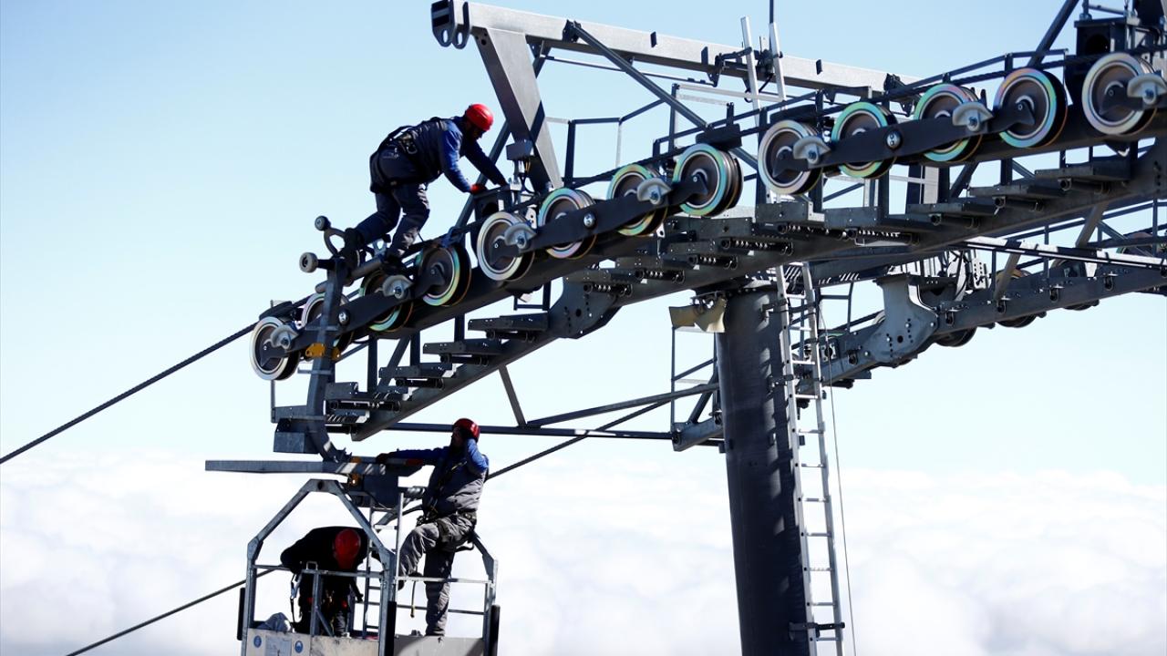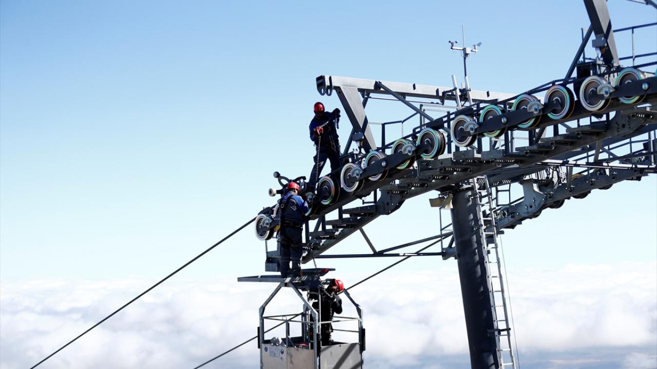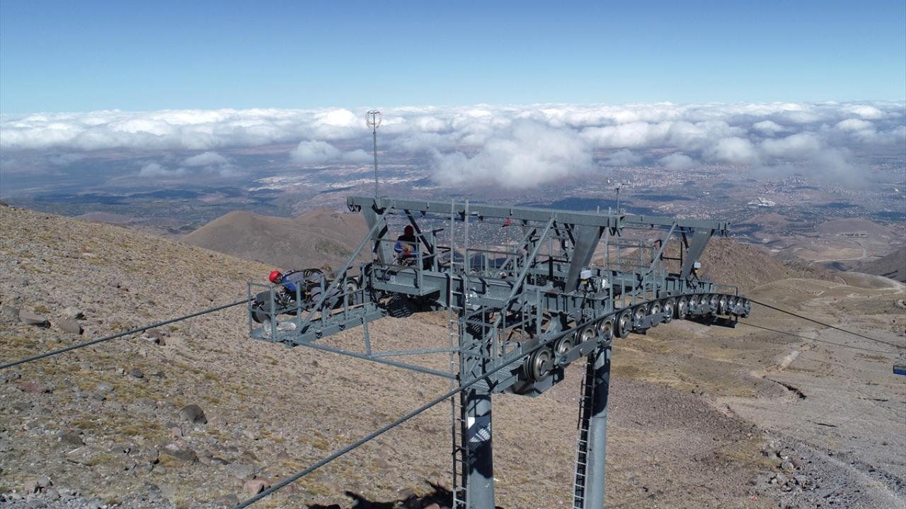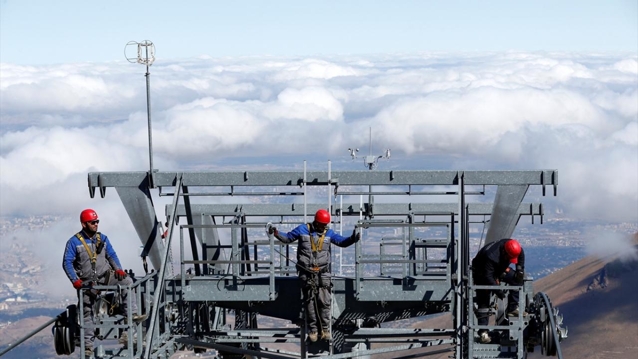 İç Anadolu'nun en yüksek dağı Erciyes'te görev yapan bakım ve onarım ekibi, 3 bin 400 metre yükseklikte, zor koşullar altında çalışarak teleferikleri yeni sezona hazırlıyor.