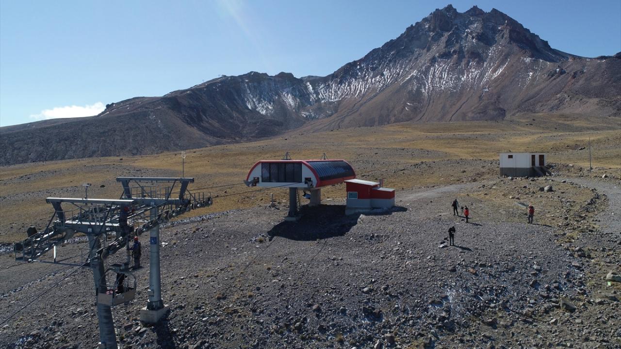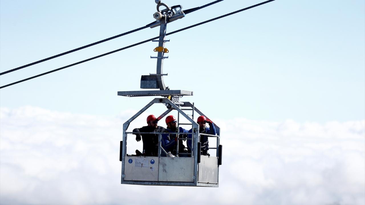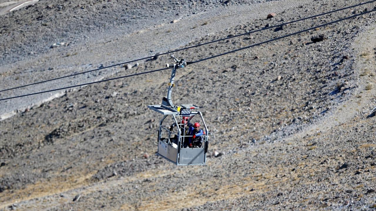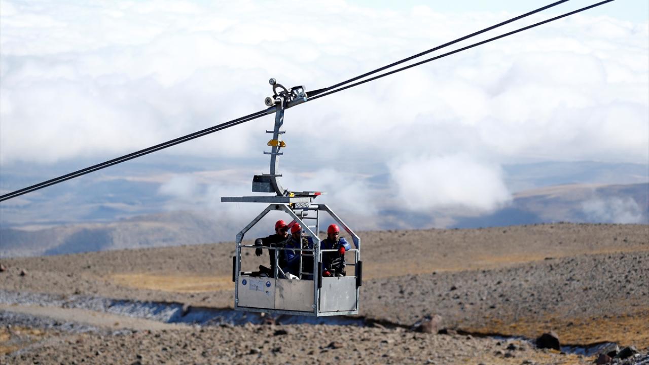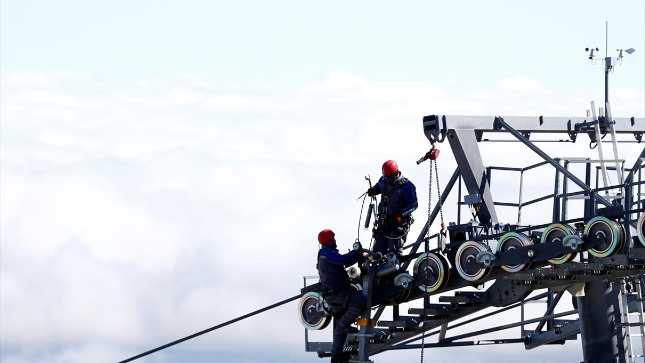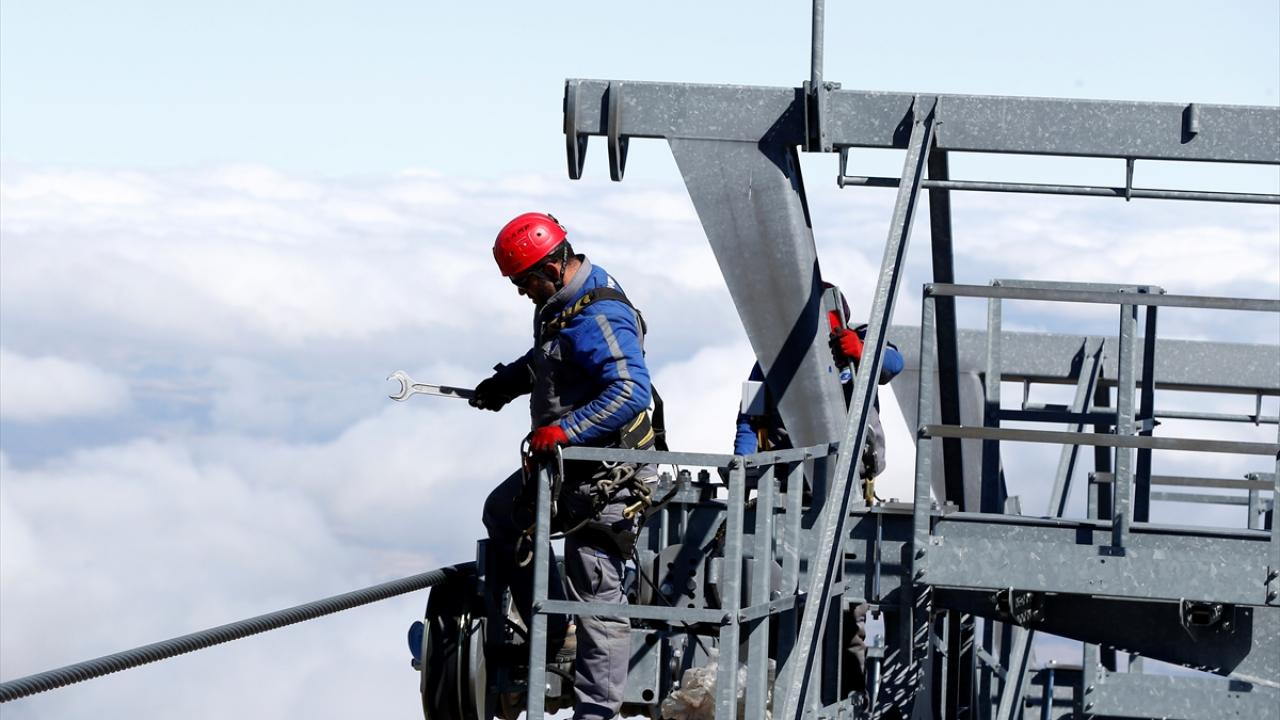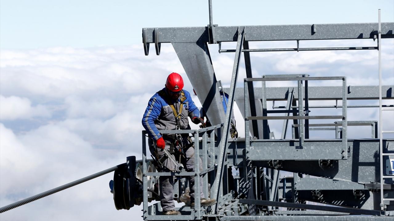 İç Anadolu'nun en yüksek dağı Erciyes'te görev yapan bakım ve onarım ekibi, 3 bin 400 metre yükseklikte, zor koşullar altında çalışarak teleferikleri yeni sezona hazırlıyor.