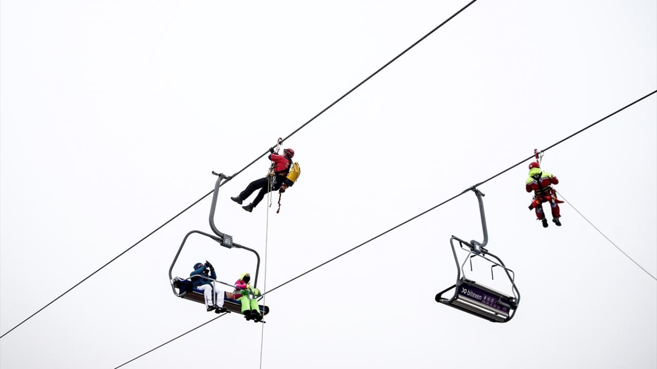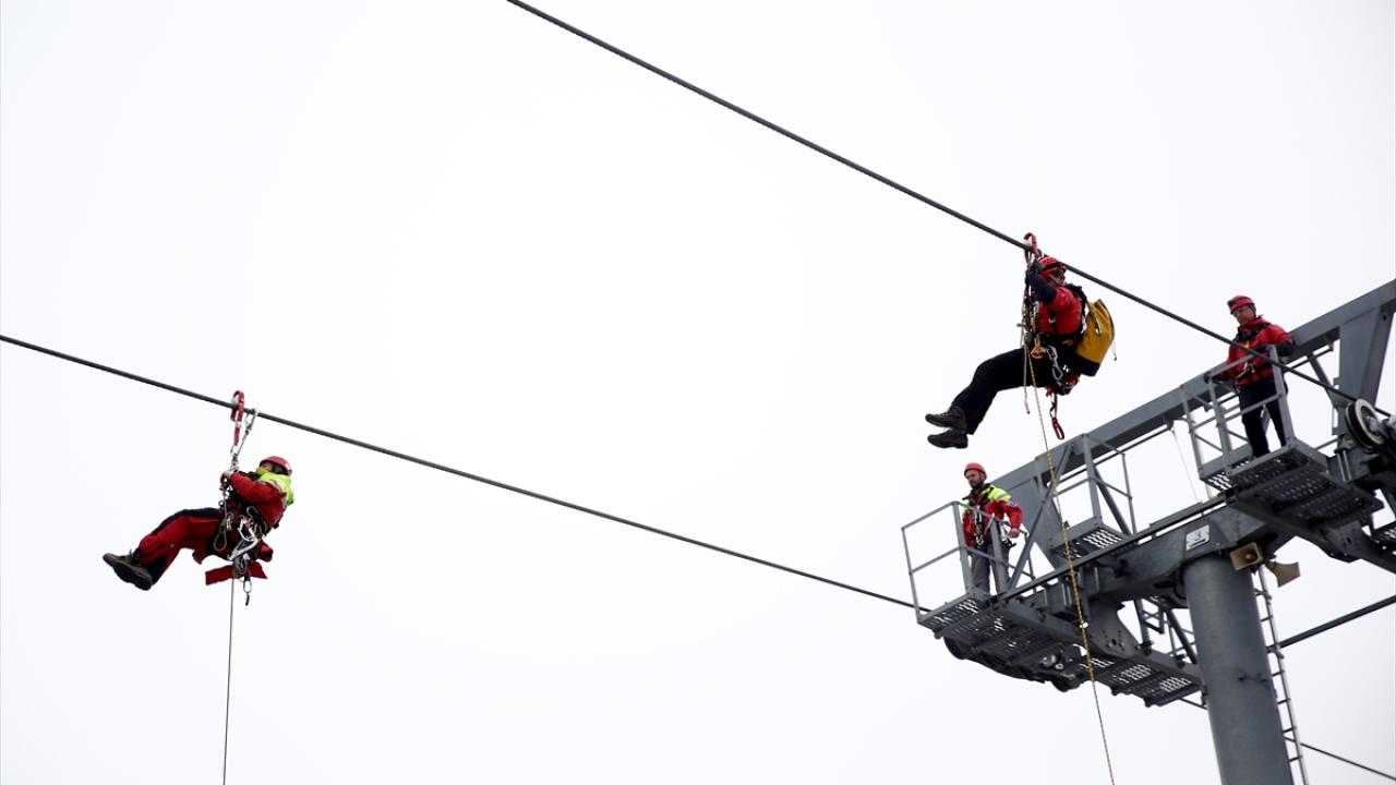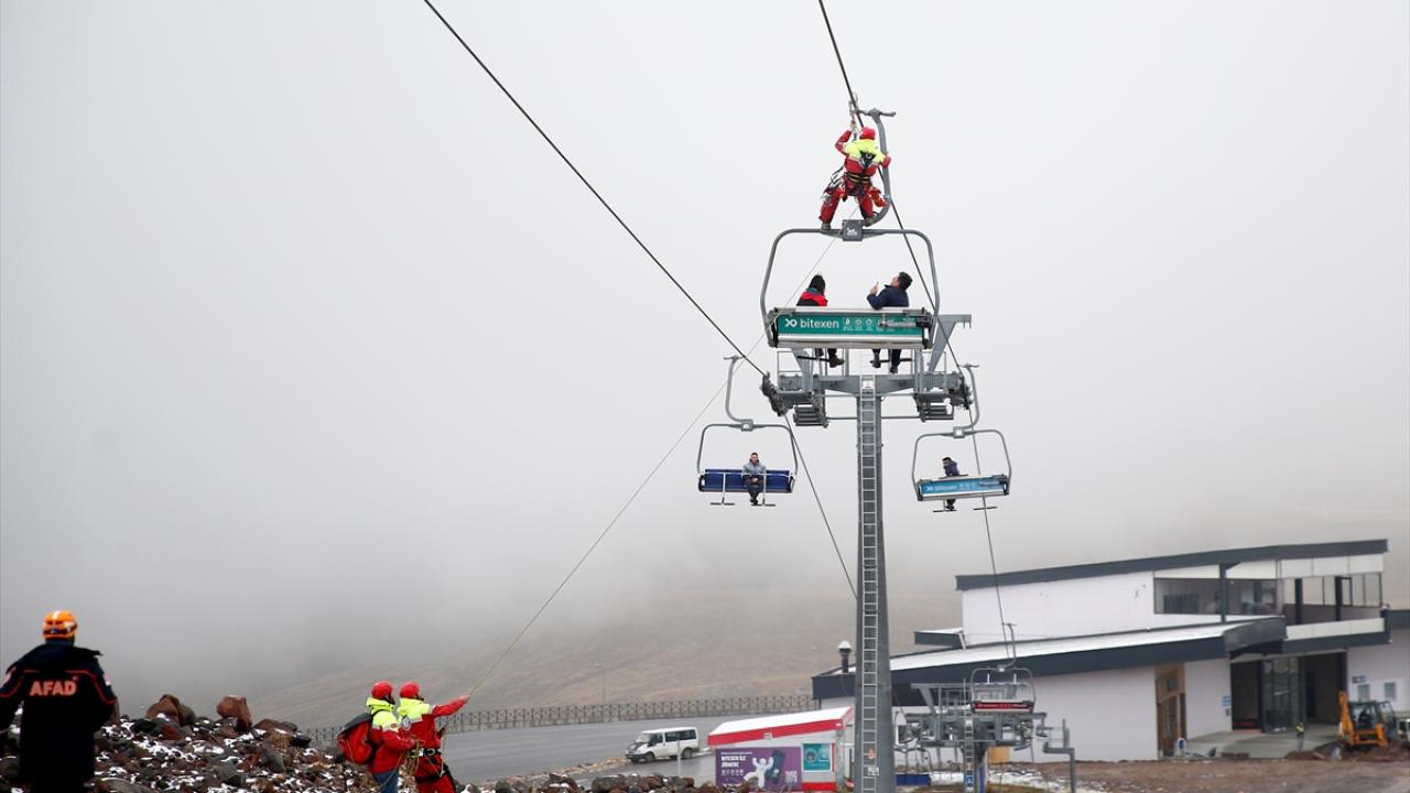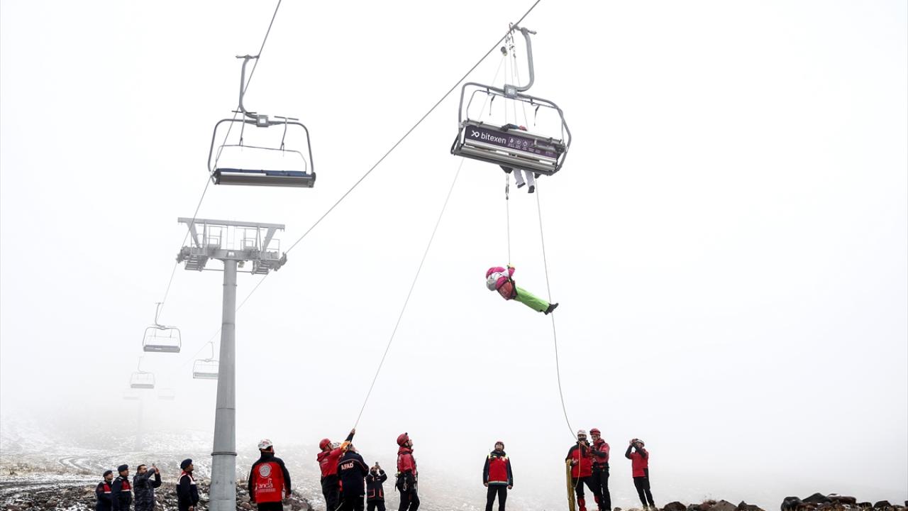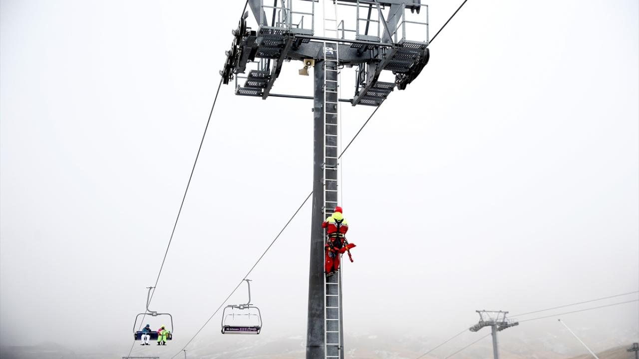 Tatbikatta senaryo gereği, tesislerde çıkan arıza nedeniyle 2 bin 400 metre rakımdaki telesiyejde mahsur kalan 6 kişi, ekipler tarafından halat yardımıyla indirildi. Teknik arıza da ekipler tarafından kısa sürede giderildi. Yaklaşık bir saat süren tatbikatta 60 kişi görev aldı.