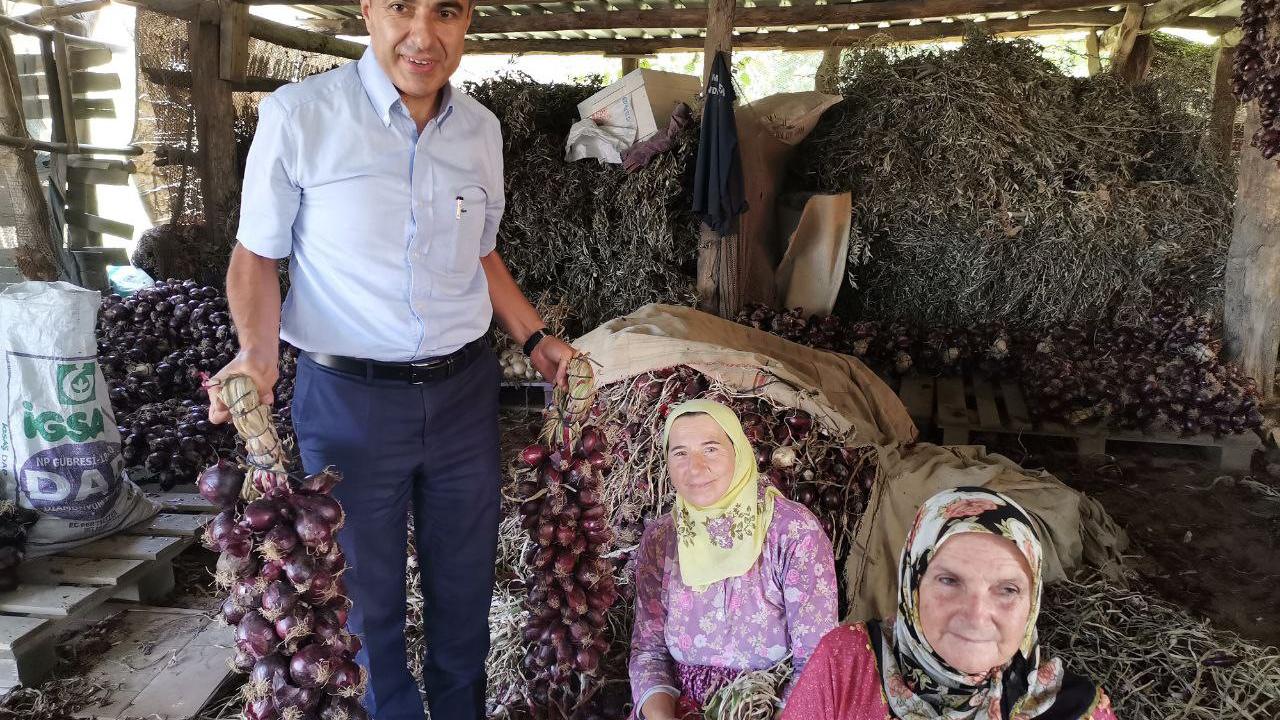 İlçede yaklaşık 500 dekar alanda yetiştirilen ve topraktan söküldükten sonra barakalarda saplarından örülen soğan, yoğun ilgi görüyor.