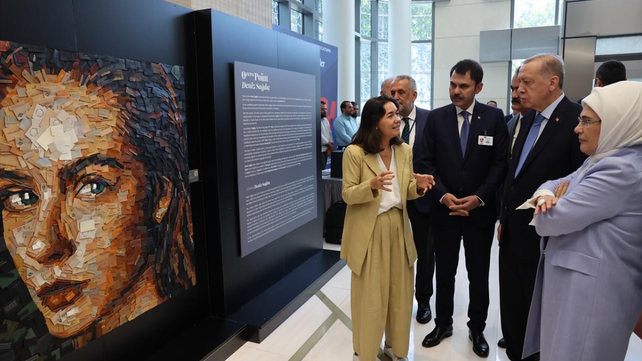 Sanatçı Deniz Sağdıç`tan atık eserler hakkında bilgi alan Cumhurbaşkanı Erdoğan, pil, ilaç, plastik, tekstil, şişe kapakları ve elektronik eşya gibi çok farklı atıklardan tasarlanan tabloları etkileyici bulduğunu söyledi.