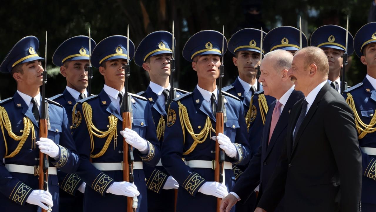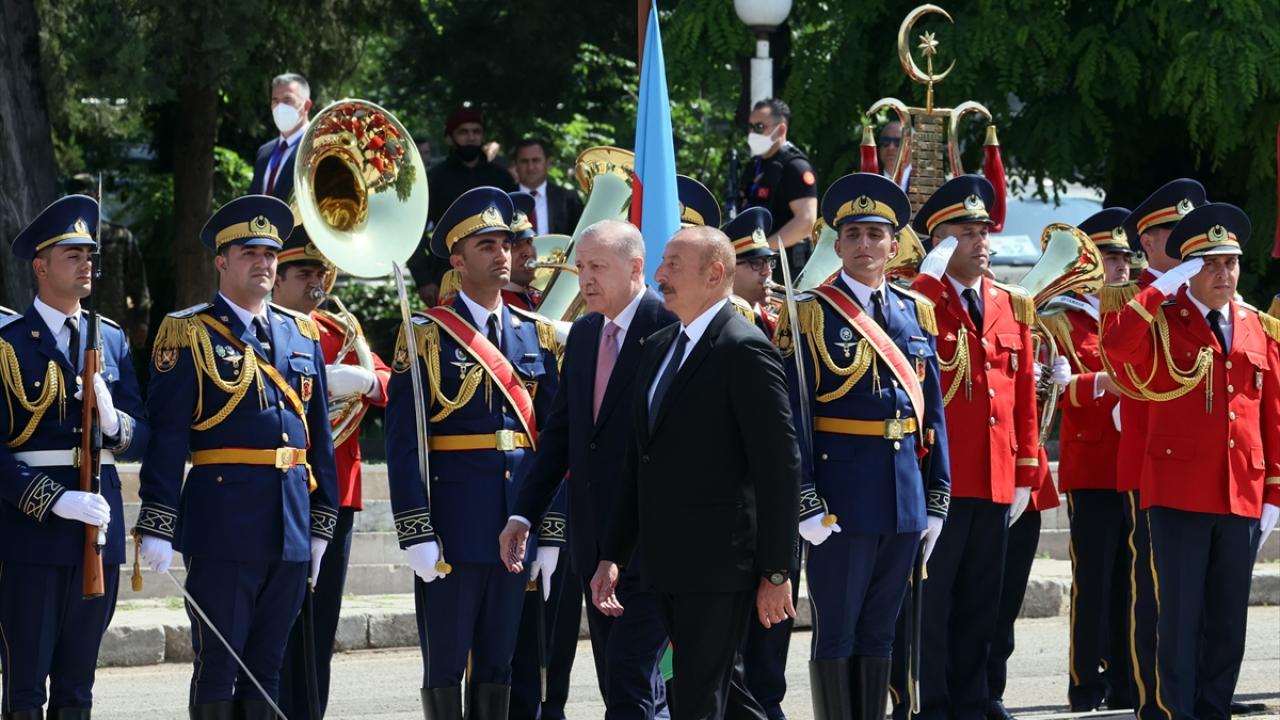Aliyev ile tören kıtasını denetleyen Cumhurbaşkanı Erdoğan, askerleri selamladı.