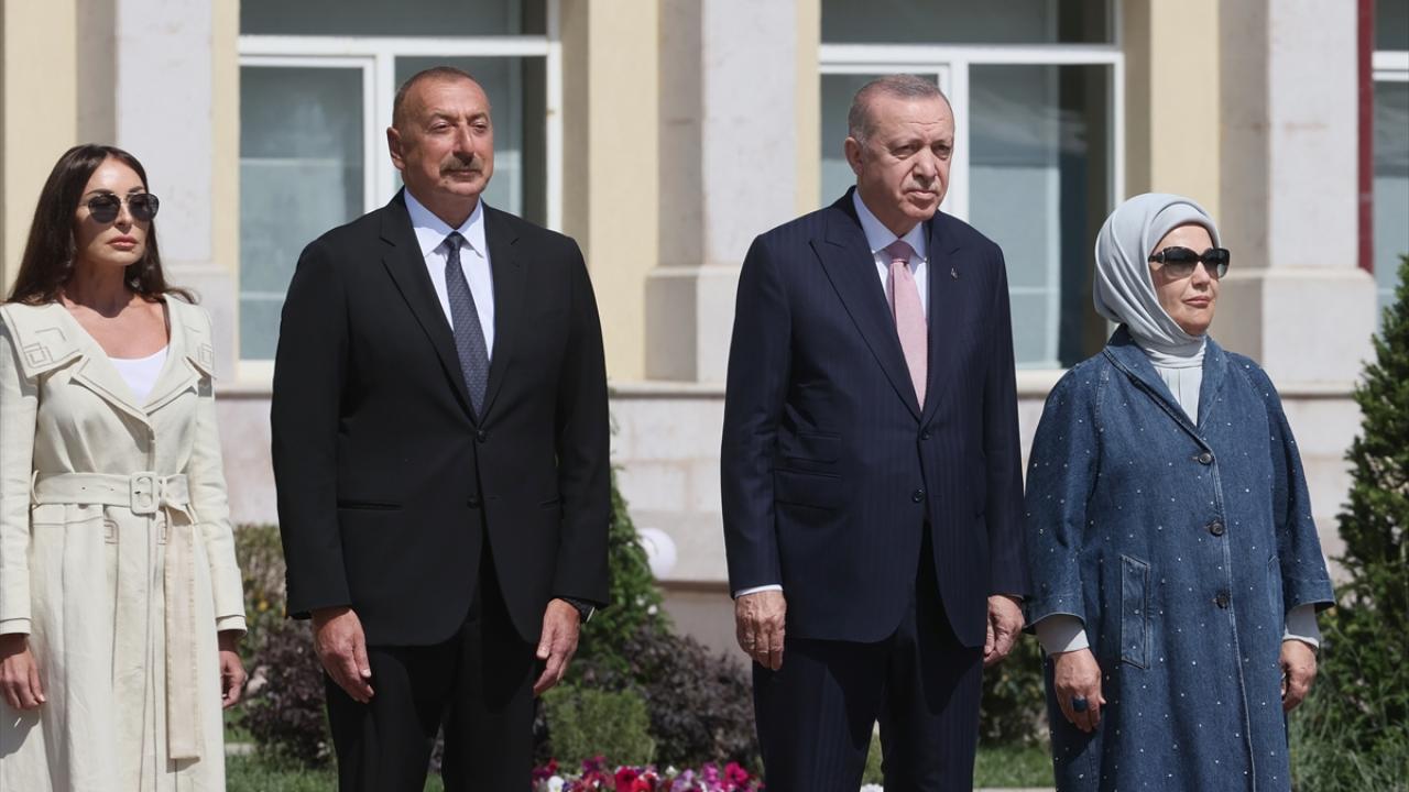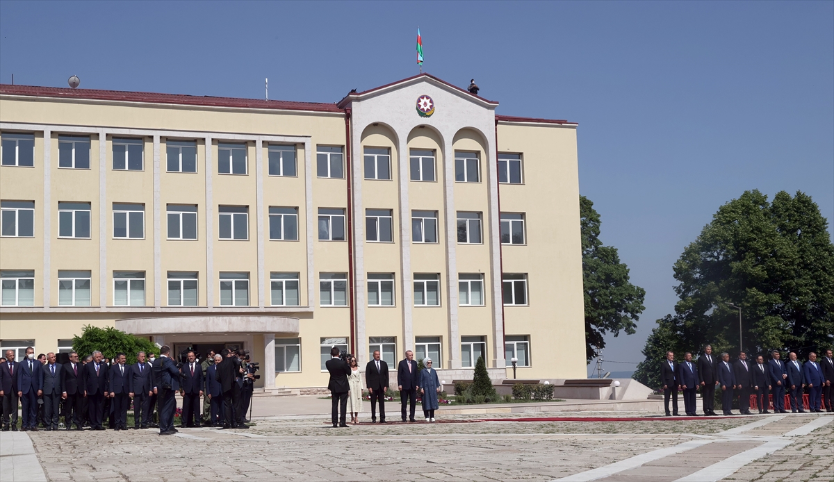 Erdoğan için Şuşa Valiliği`nde karşılama töreni düzenlendi. Aliyev, Erdoğan`ı makam aracından inişinde karşıladı.