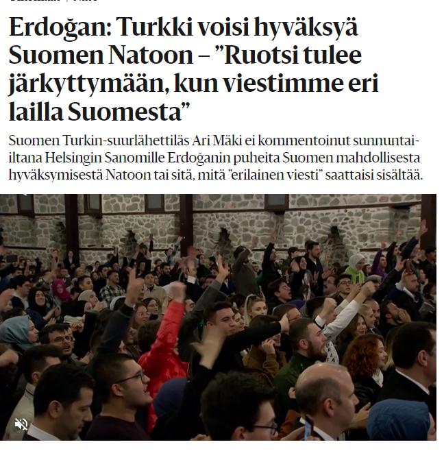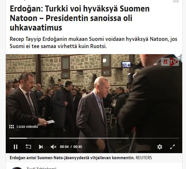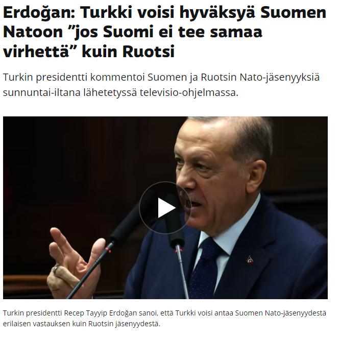 Finlandiya Devlet Televizyonu da Erdoğan`ın açıklamalarına, "Türkiye, Finlandiya`yı İsveç`le "aynı hatayı yapmazsa" NATO`ya kabul edebilir" ifadeleriyle yer verdi.