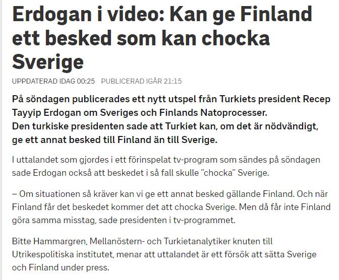 İsveç Devlet Televizyonu da web sitesindeki haberinde Cumhurbaşkanı Erdoğan`ın açıklamalarını,"Finlandiya`ya İsveç`i şok edecek bir mesaj verebiliriz" başlığıyla okuyucularına aktardı.