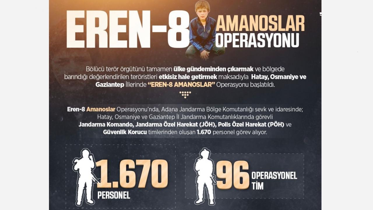 İçişleri Bakanlığı Hatay, Osmaniye ve Gaziantep kırsalında Eren-8 Amanoslar Operasyonu’nun başlatıldığını duyurdu.