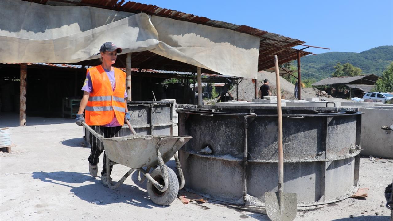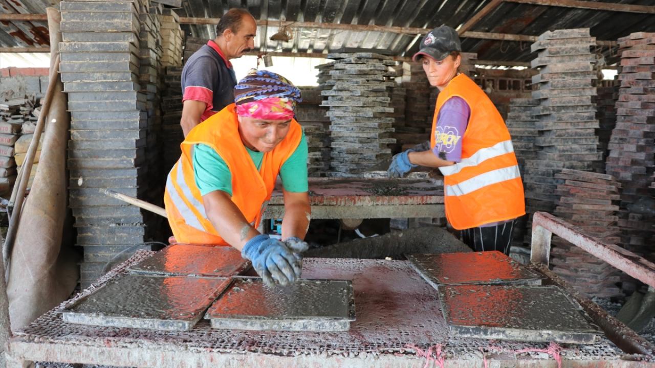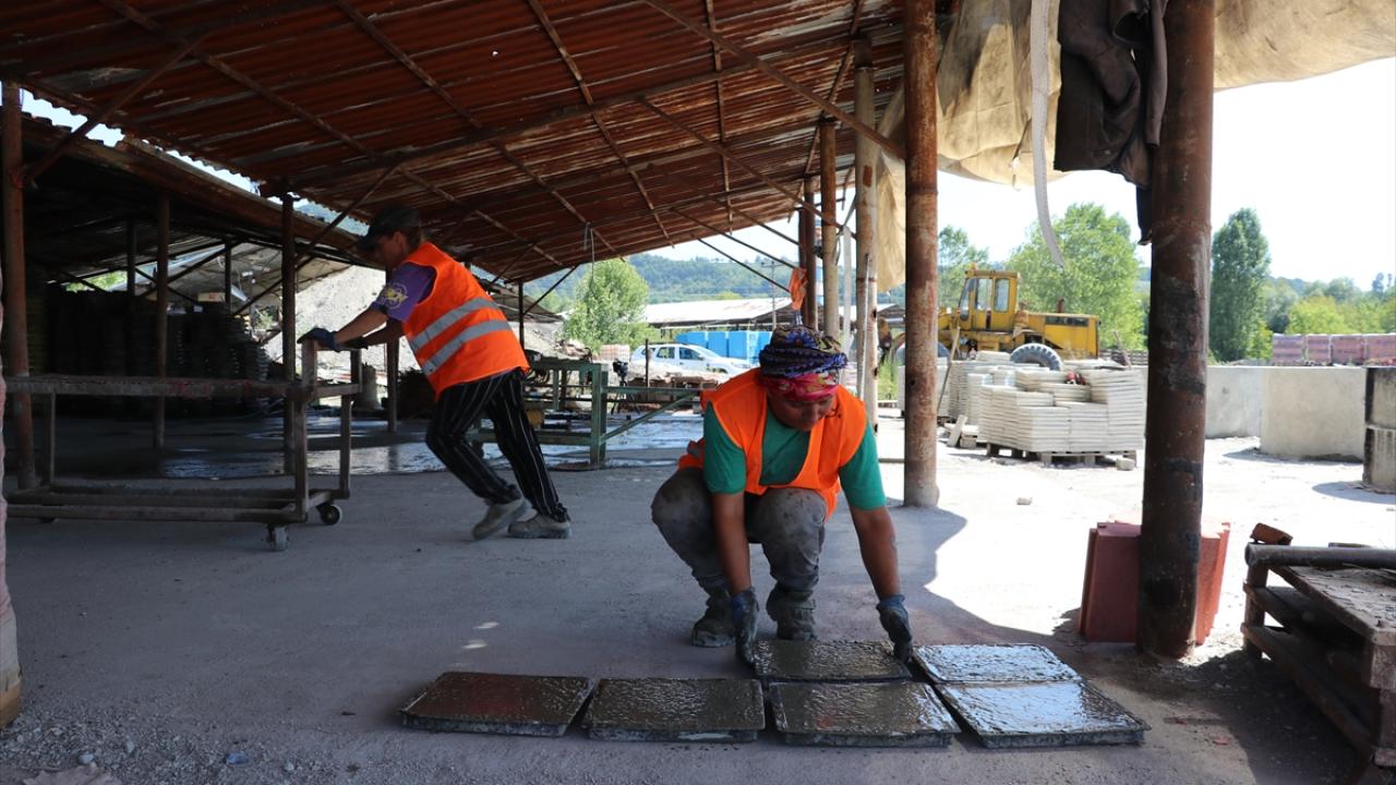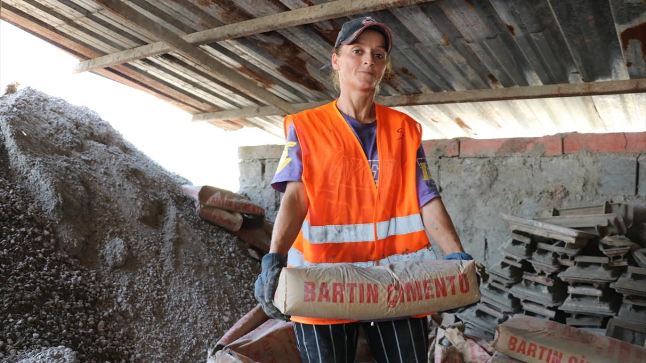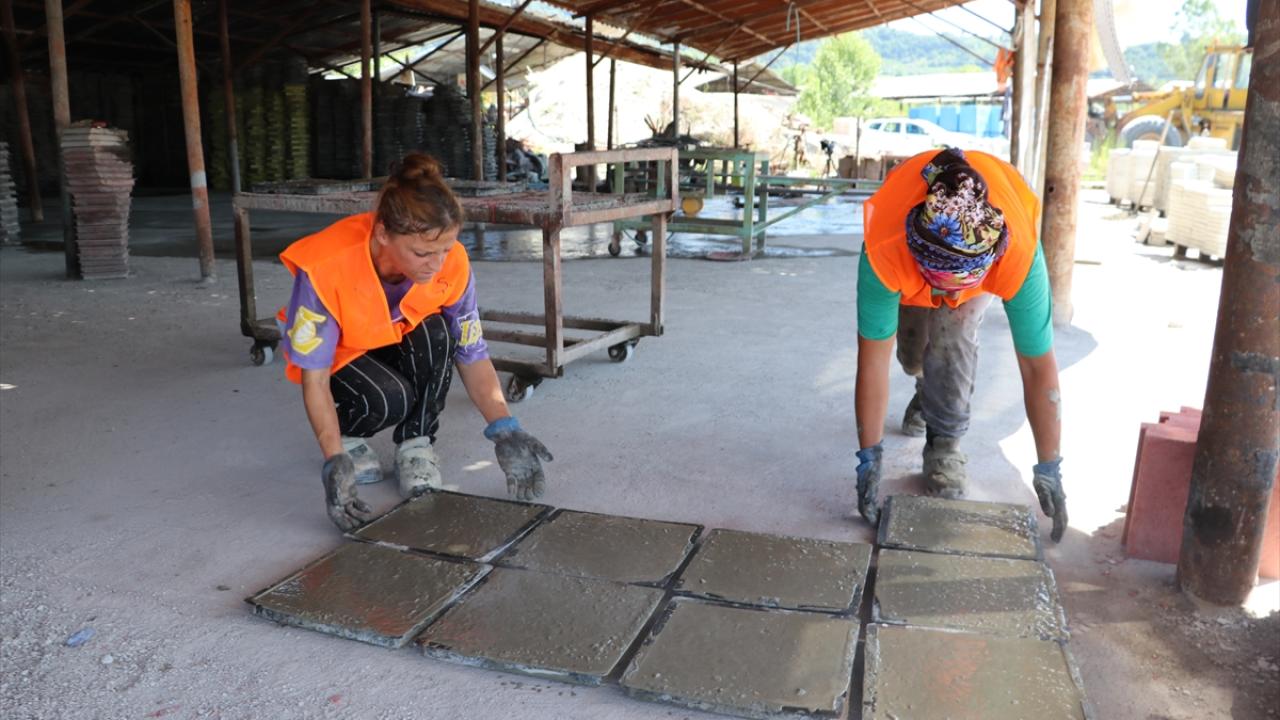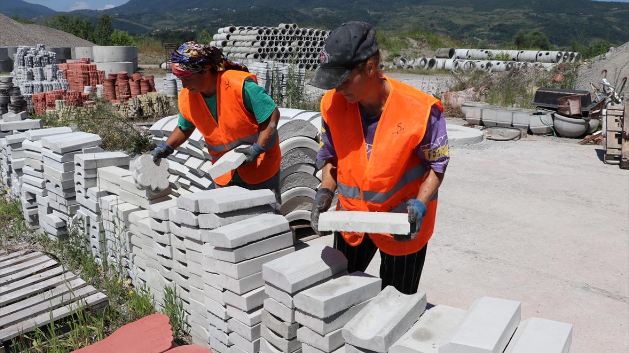 Zonguldak'ın Çaycuma ilçesinde beton ve yapı malzemeleri üreten bir firmada çalışan Yasemin Menteşe ve Ayten Kaygılı, çimento taşıyıp harç karıştırıp kalıp dökerek ailelerinin geçimine katkı sağlıyor.