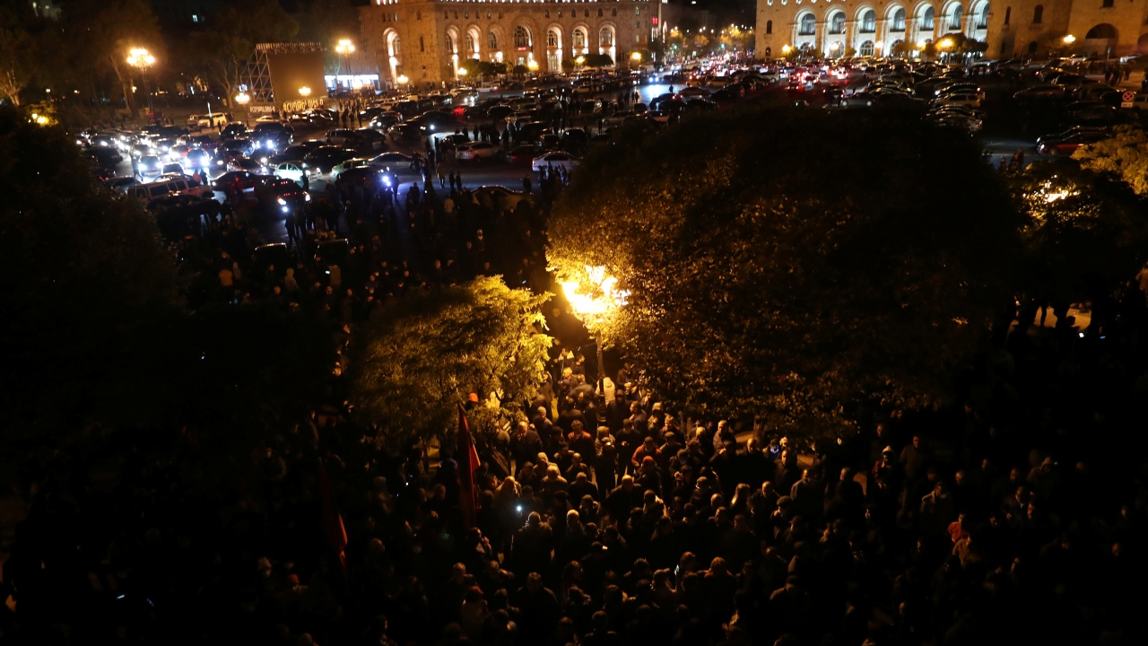 Ermenistan’ın başkenti Erivan`da protestocular, Paşinyan’ın Dağlık Karabağ’da yenilgiyi kabul etmesinin ardından hükümet binası önünde toplandı.
