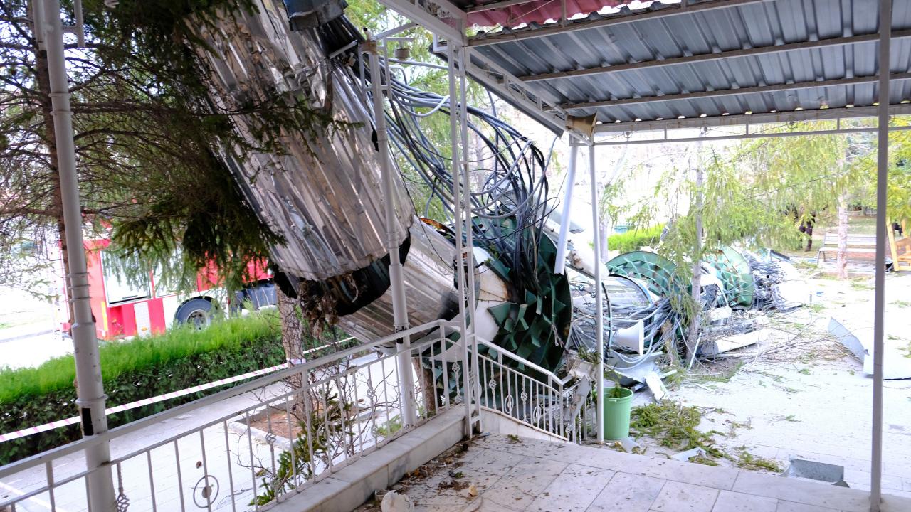 Uçan parçaların yoldan geçenlere zarar vermemesi için yol trafiğe kapatılırken, düşen çatı parçaları nedeniyle bir otomobilde hasar meydana geldi.