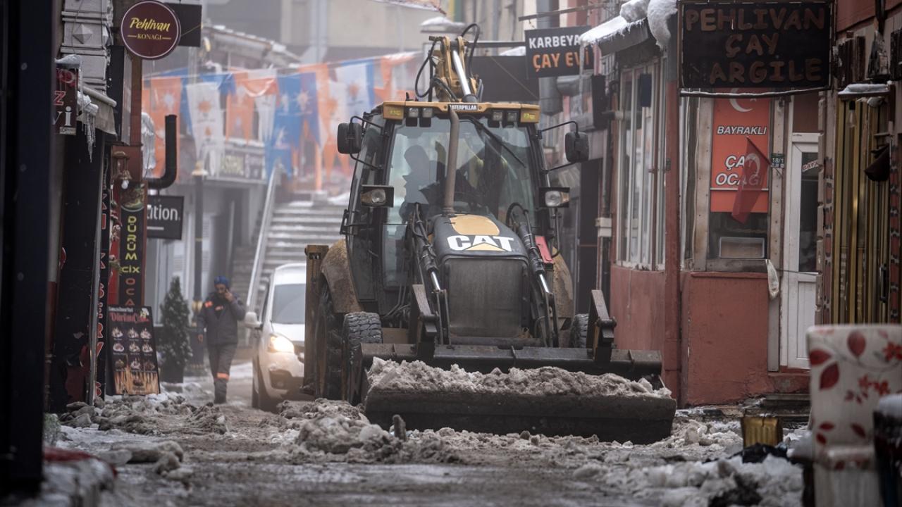 Belediye ekipleri yol ve kaldırımlarda kar temizleme çalışması yürütüyor.