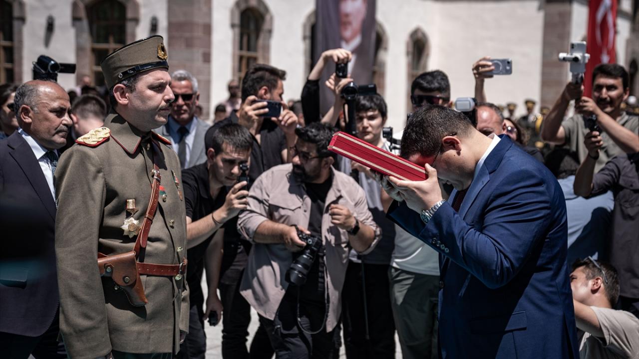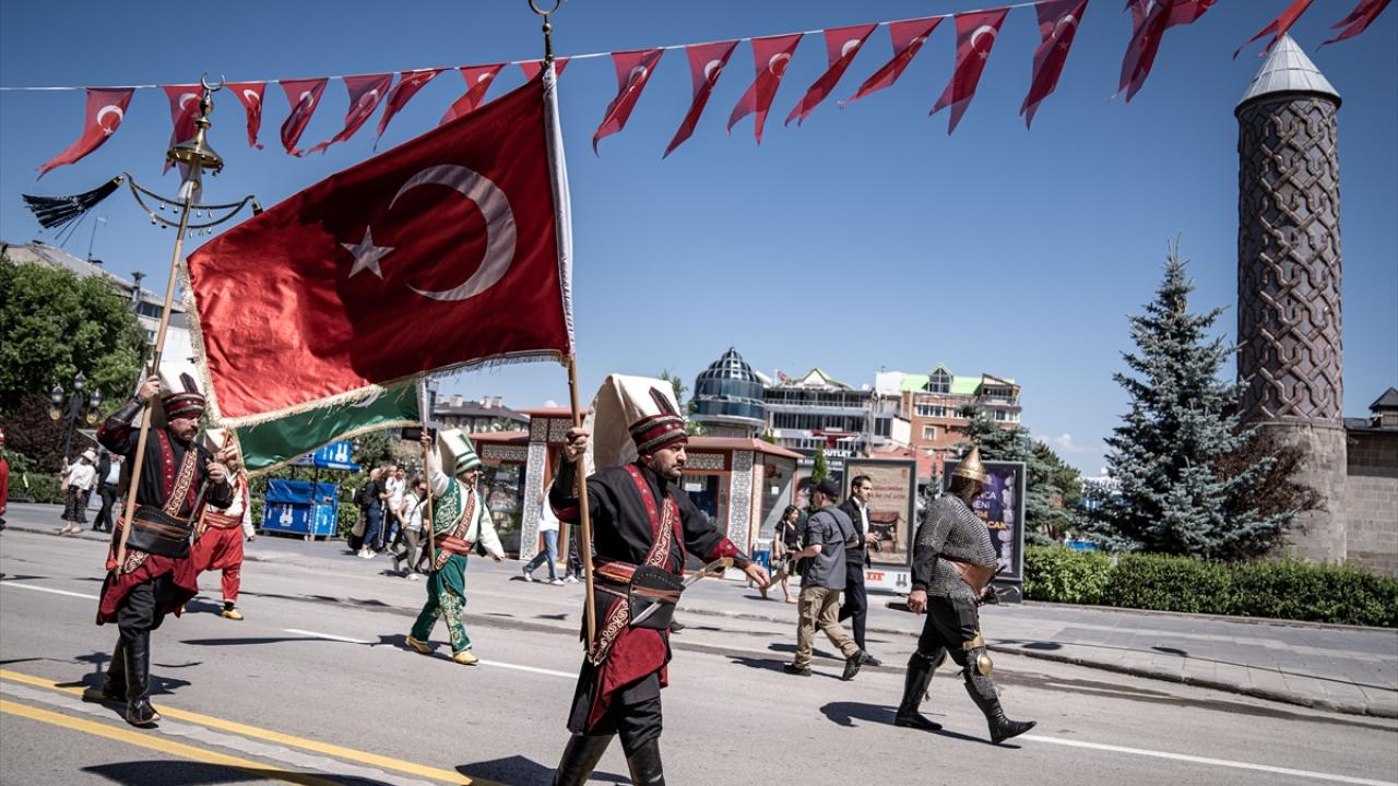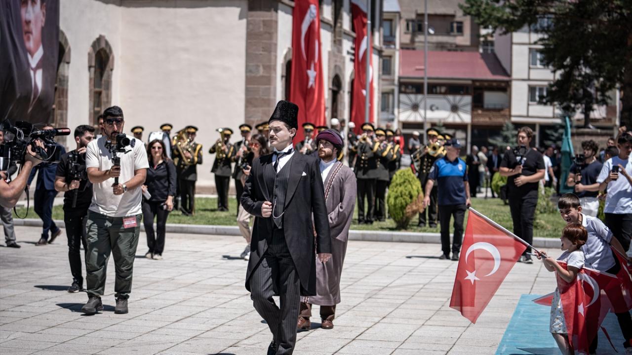Gazi Mustafa Kemal Atatürk`ü canlandıran Erzurum Devlet Tiyatrosu oyuncusu, atlı faytonla yürüyüşe öncülük etti. Ardından Kongre Binası bahçesinde Vali Yardımcısı Özdemir, başka bir oyuncudan Türk bayrağını öperek teslim aldı.