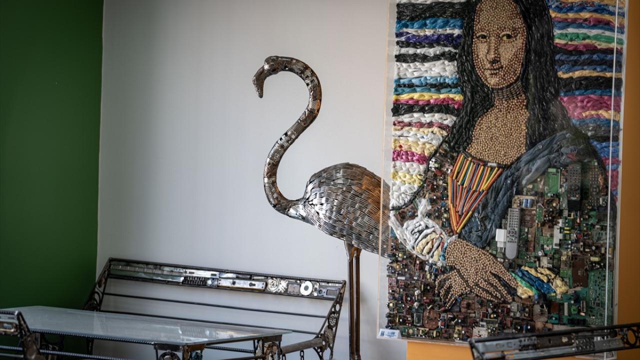 Sanatçıların özenle hazırladığı geri dönüşüm eşyaları, hem kafe hem de bilgievi olarak kullanılacak alanda yerini aldı.