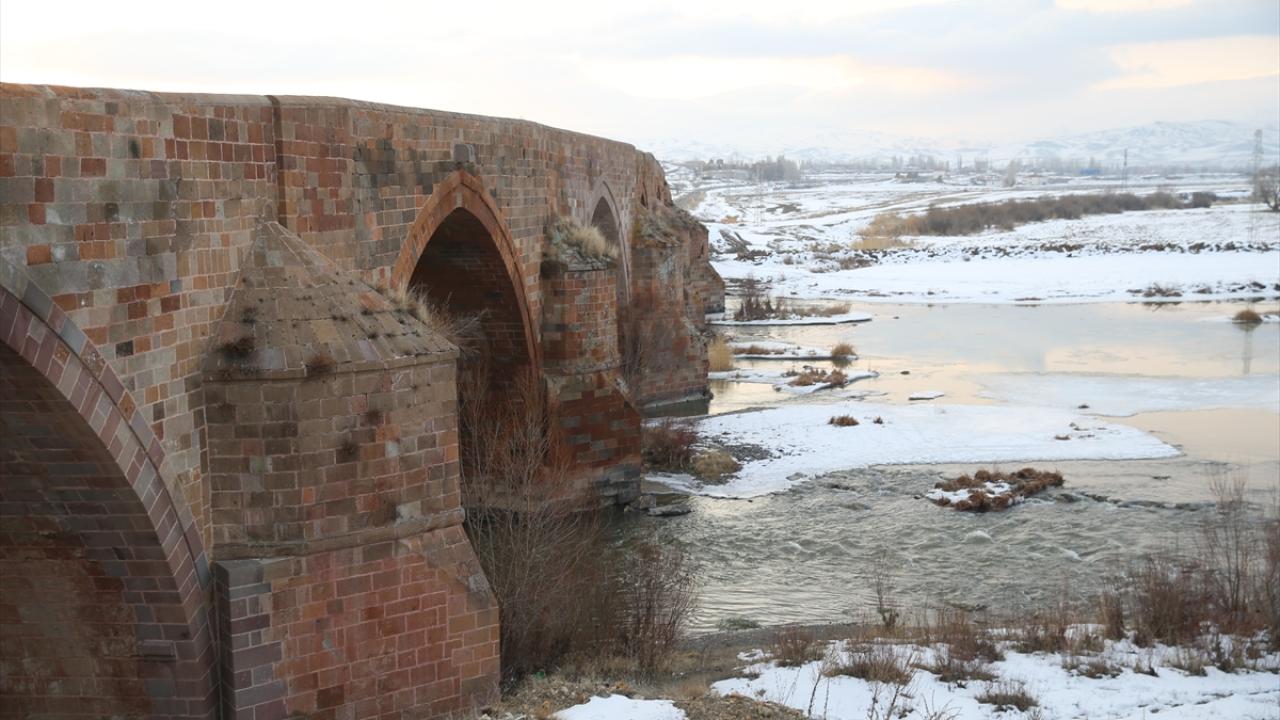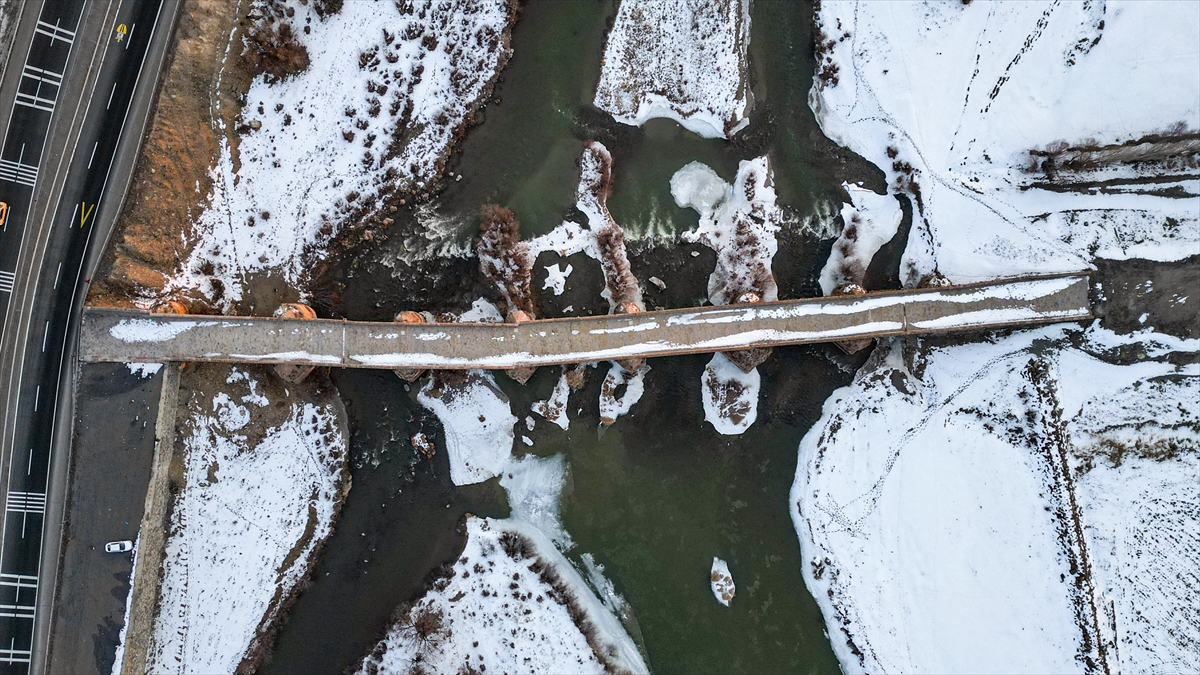 Dondurucu soğukların hüküm sürdüğü bölgede, kesme taştan inşa edilen köprünün kemerleri kar örtüsüyle kaplandı, altından geçen dere ise kısmen buz tuttu.