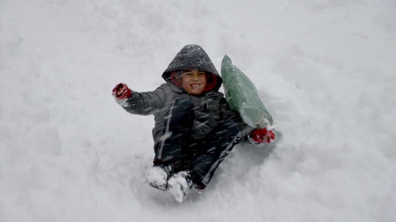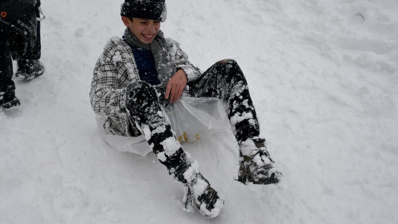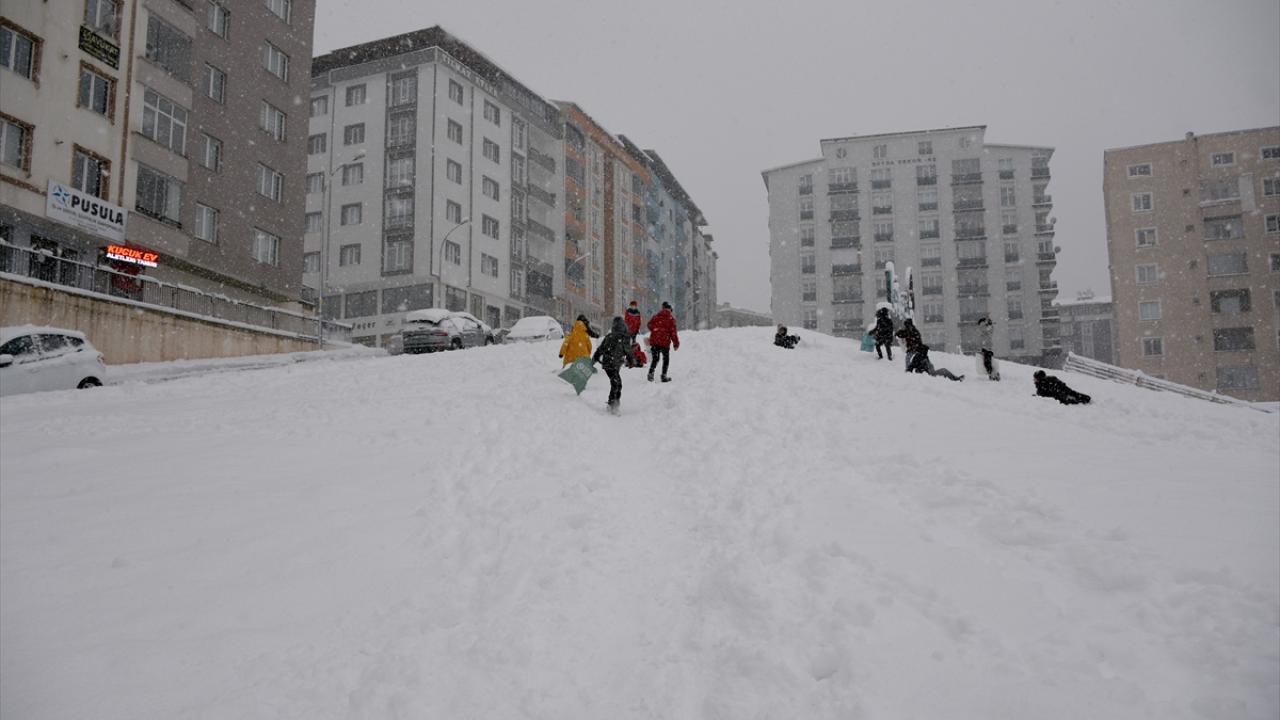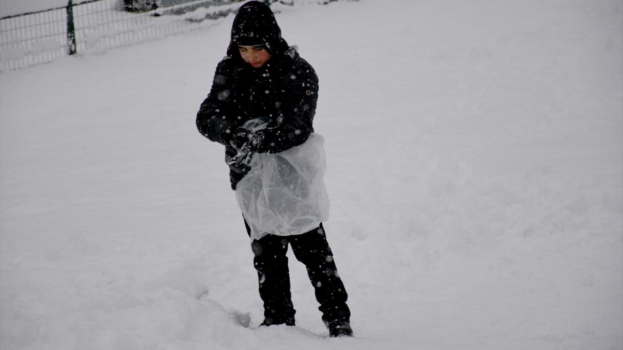 Erzurum'da kar yağışı etkisini sürdürüyor. Kent merkezinde kar yağışını fırsat bilen çocuklar, yüksek tepelerden poşetlerle kayarak eğlendi.