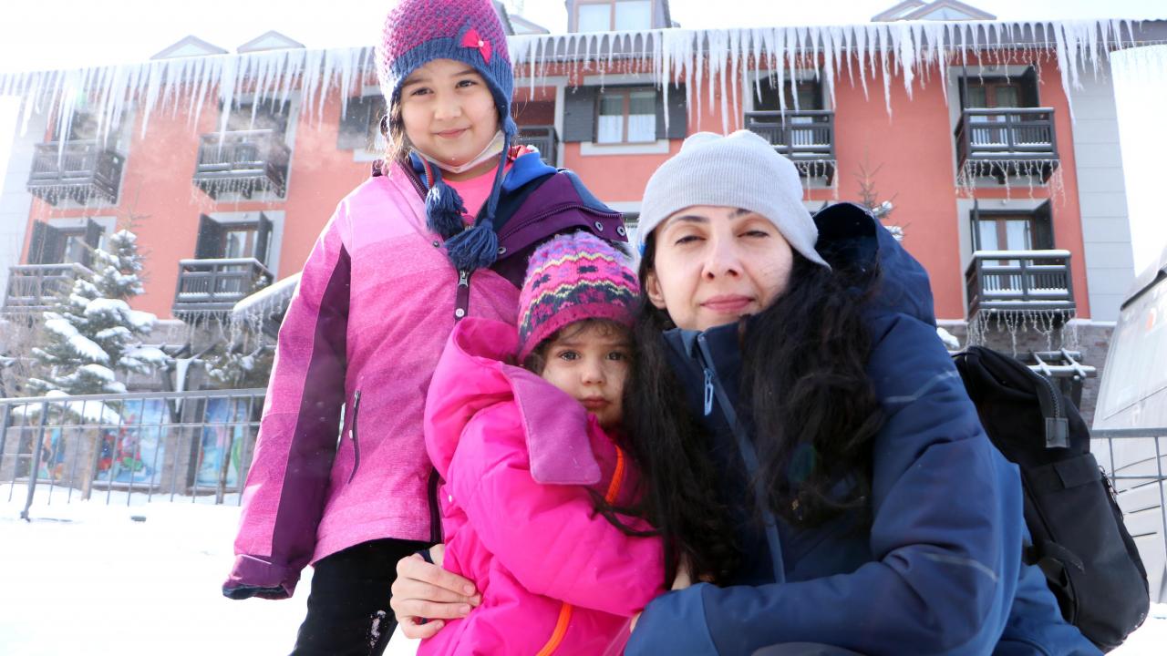 Tatilciler, uzunluğu yaklaşık 3 metreyi kalınlığı ise 30 santimi bulan buz sarkıtlarıyla birlikte hatıra fotoğrafı çektirdi.