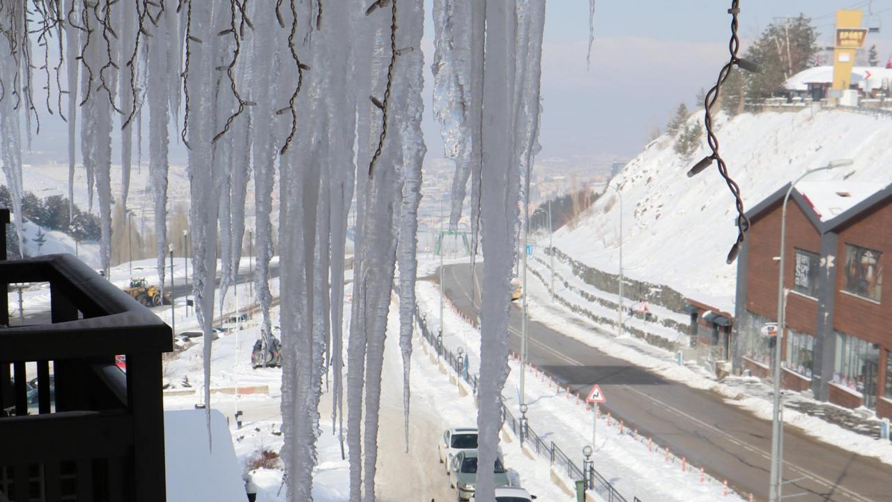 Erzurum'da, etkili olan soğuk havayla birlikte çatılarda oluşan buz sarkıtlarının boyu 3 metreye ulaştı. 3 bin 176 metre yükseklikteki Palandöken Kayak Merkezi'nde bulunan otellerin çatılarında oluşan sarkıtlar, ilgi çekti.