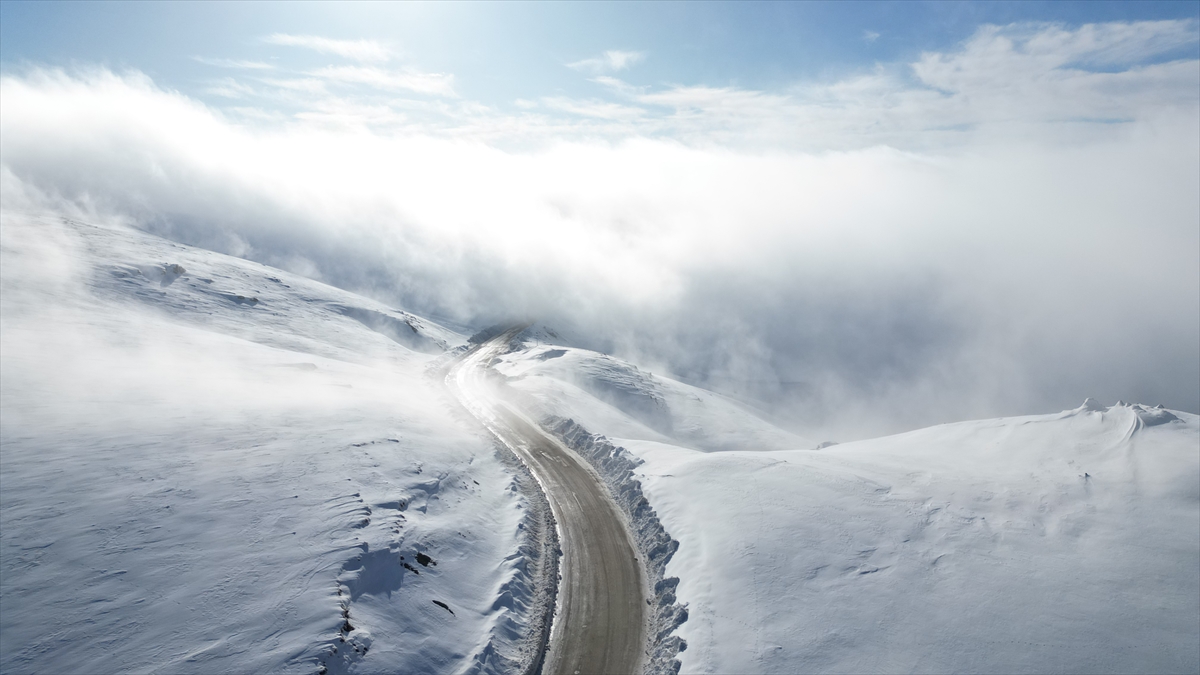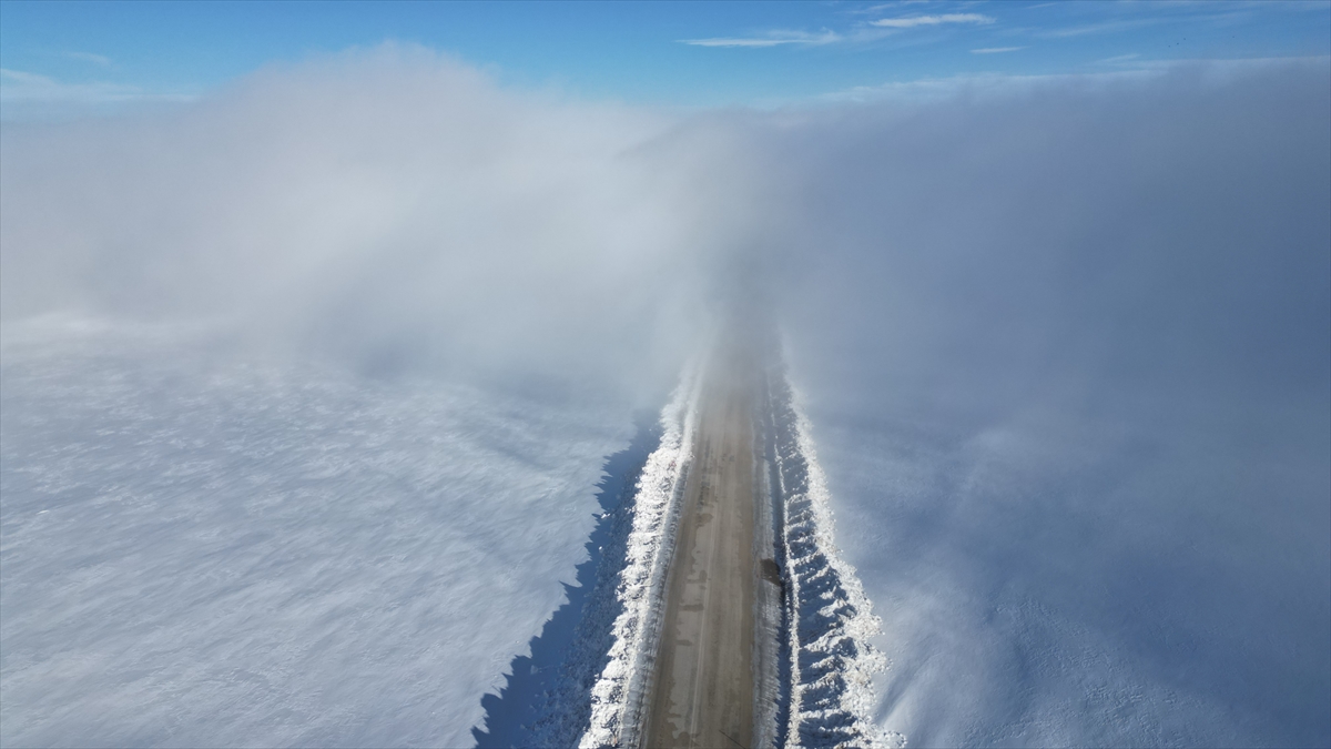 Kar ve sisle kaplı ilçe dronla görüntülendi.