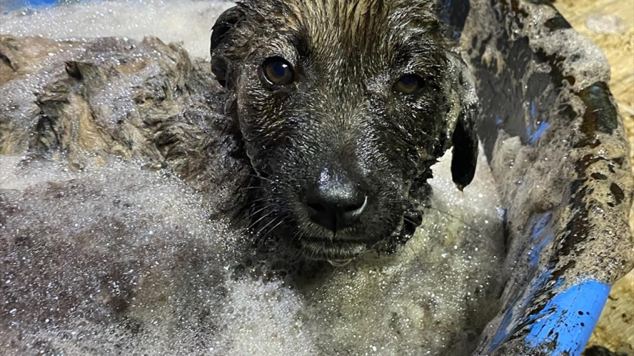 Merkez görevlilerince köpek yavruları, özel müdahaleyle ziftten arındırıldı.