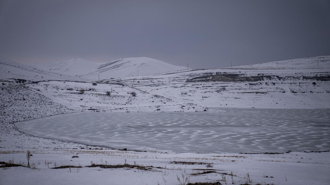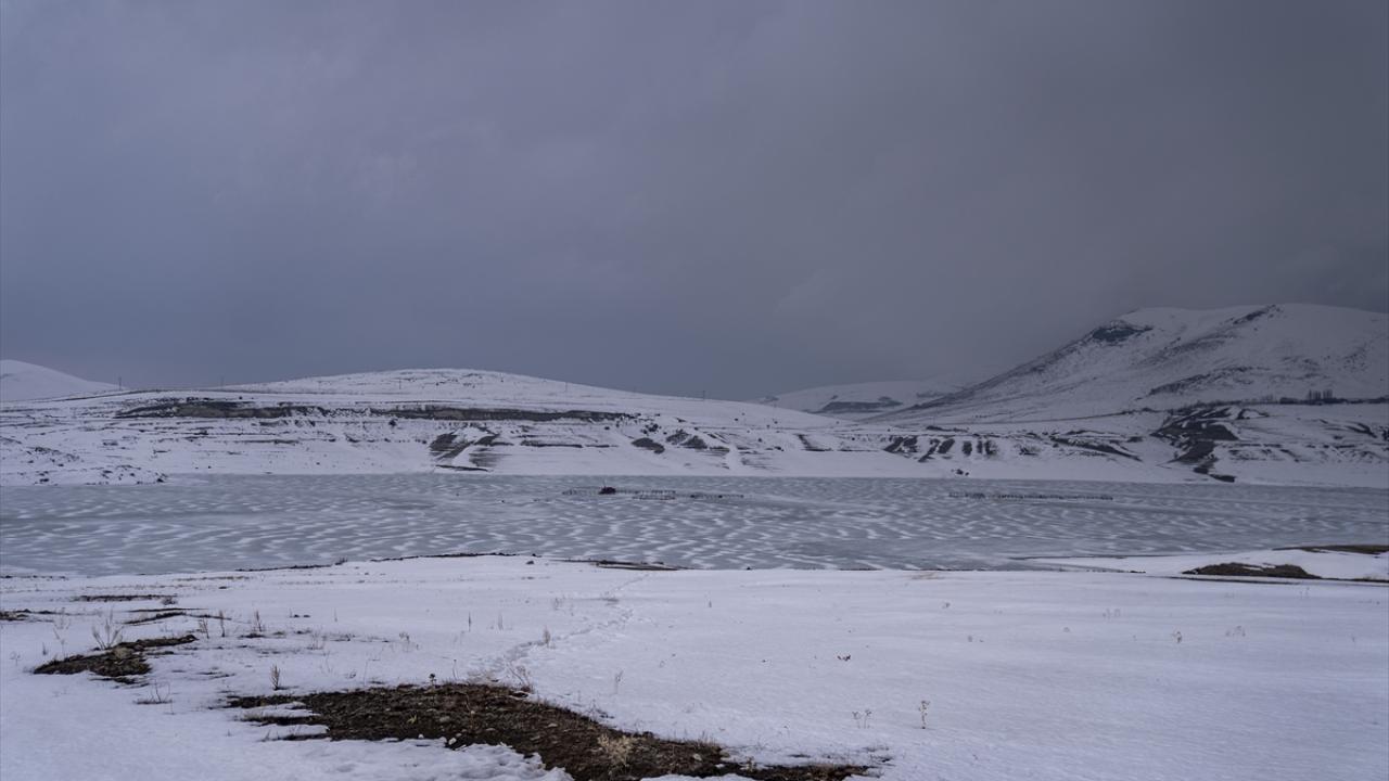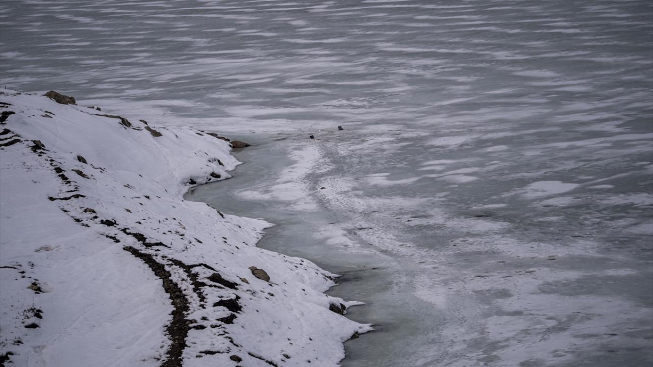 Erzurum'un Pasinler ilçesindeki Demirdöven Barajı'nın yüzeyi buzla kaplandı.