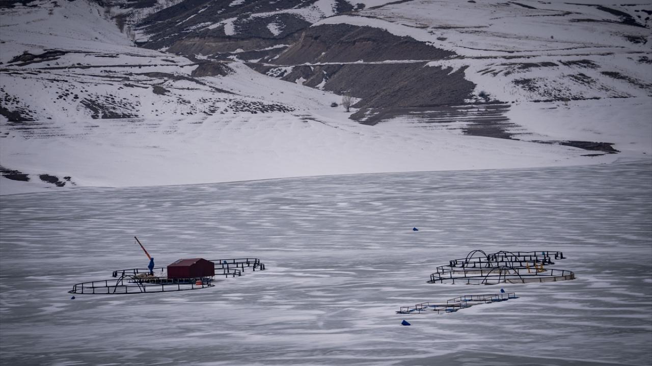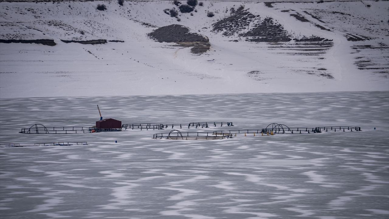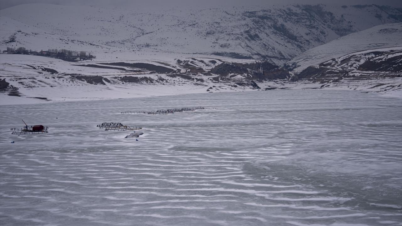 Balıkçılık da yapılan barajın ortasında yer alan kafesler, soğuk havanın etkisiyle buza gömüldü.