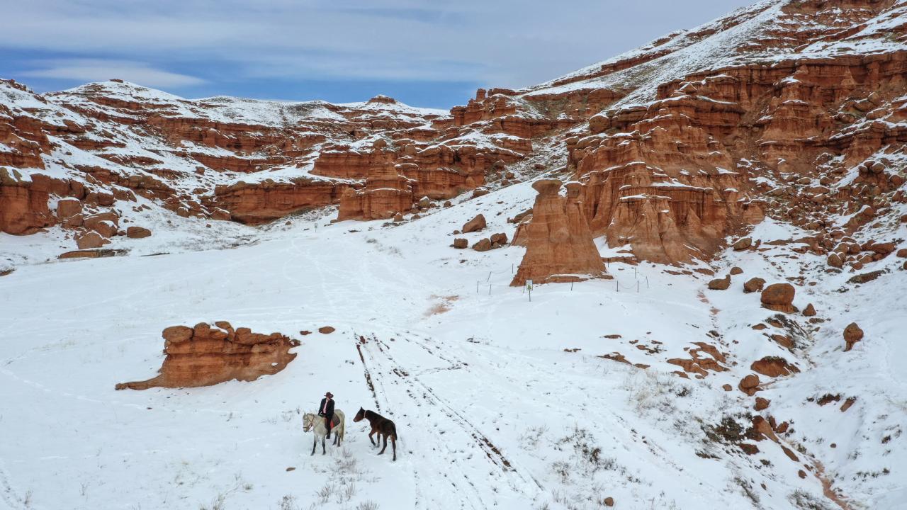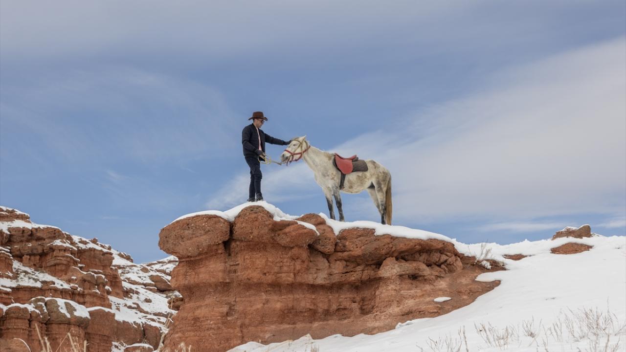 Erzurum'un karla kaplı Narman ilçesindeki peribacalarına gelen ziyaretçiler, beyaz örtü üzerinde atlarını dörtnala koşturup gezinti yaptı. Bölgenin önemli turizm potansiyelinin başında yer alan peribacalarına atlarıyla gelen bazı ziyaretçiler de dikkat çekti. Atlarını kar üzerinde dört nala koşturan vatandaşlar, eşsiz manzarada keyifli vakit geçirdi.