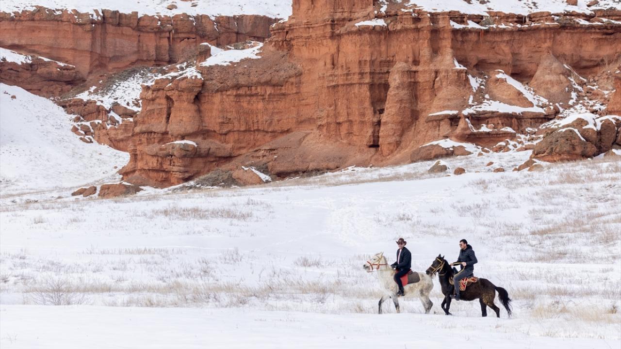 Erzurum'daki Narman Peribacaları’nda kar üstünde dörtnala gezi