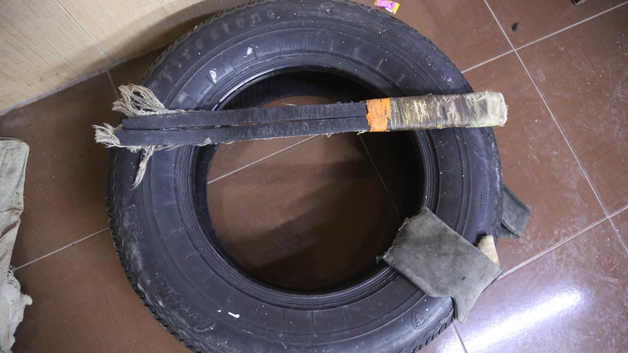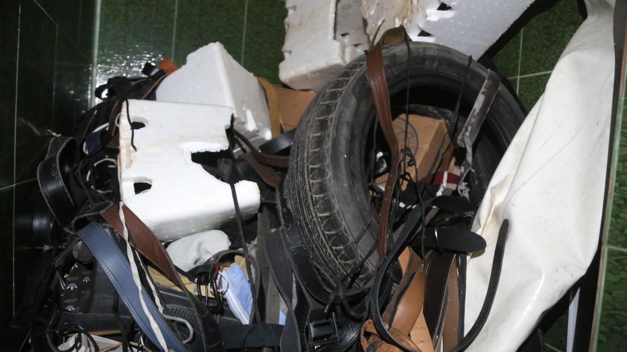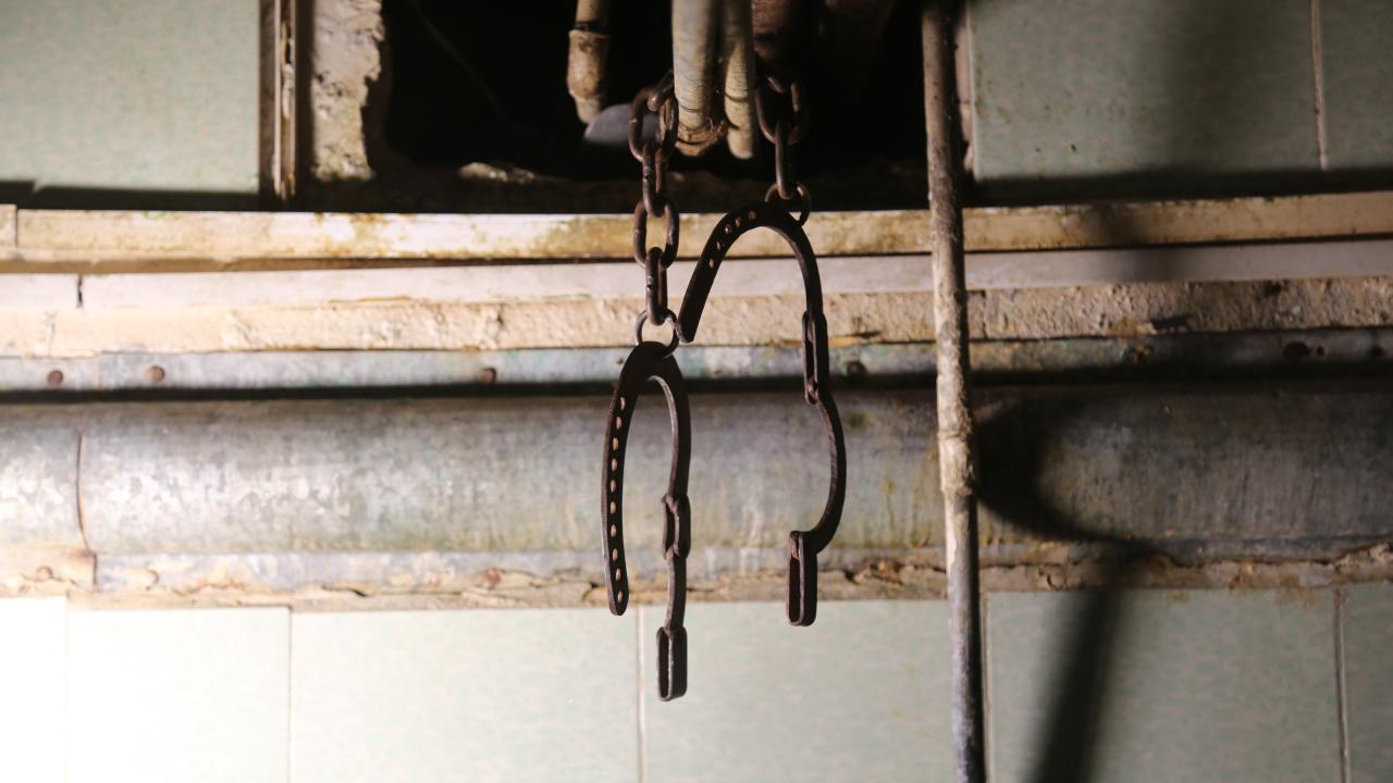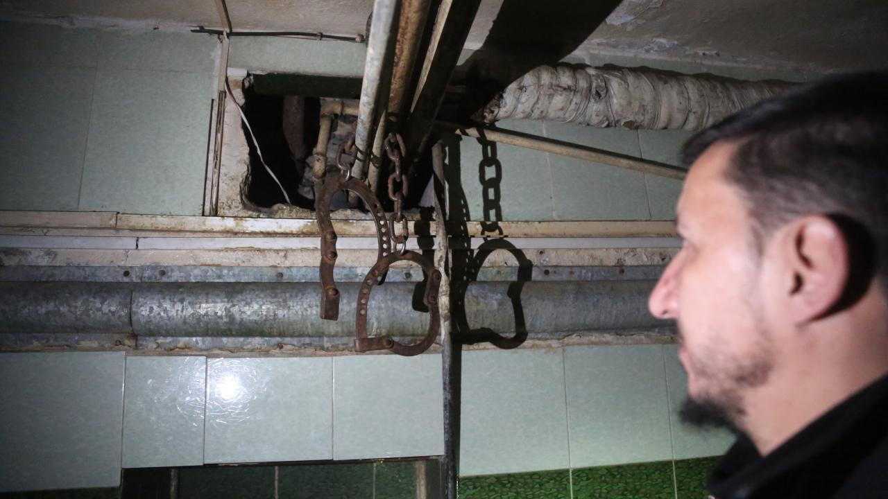 Fiziksel işkencelerde kullanılan kırbaç, göz bantları, teker lastiği ve tavana asılı zincirli kelepçeler görüntülere yansıdı.