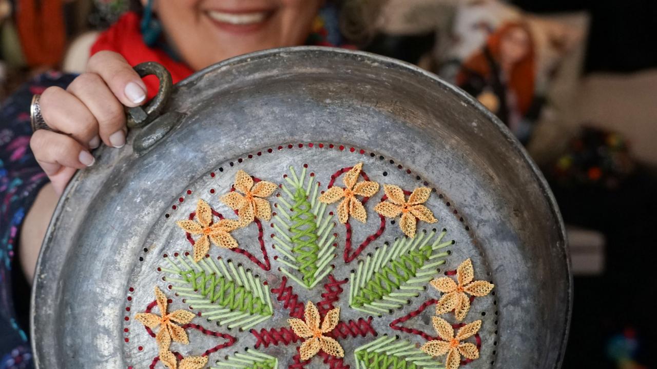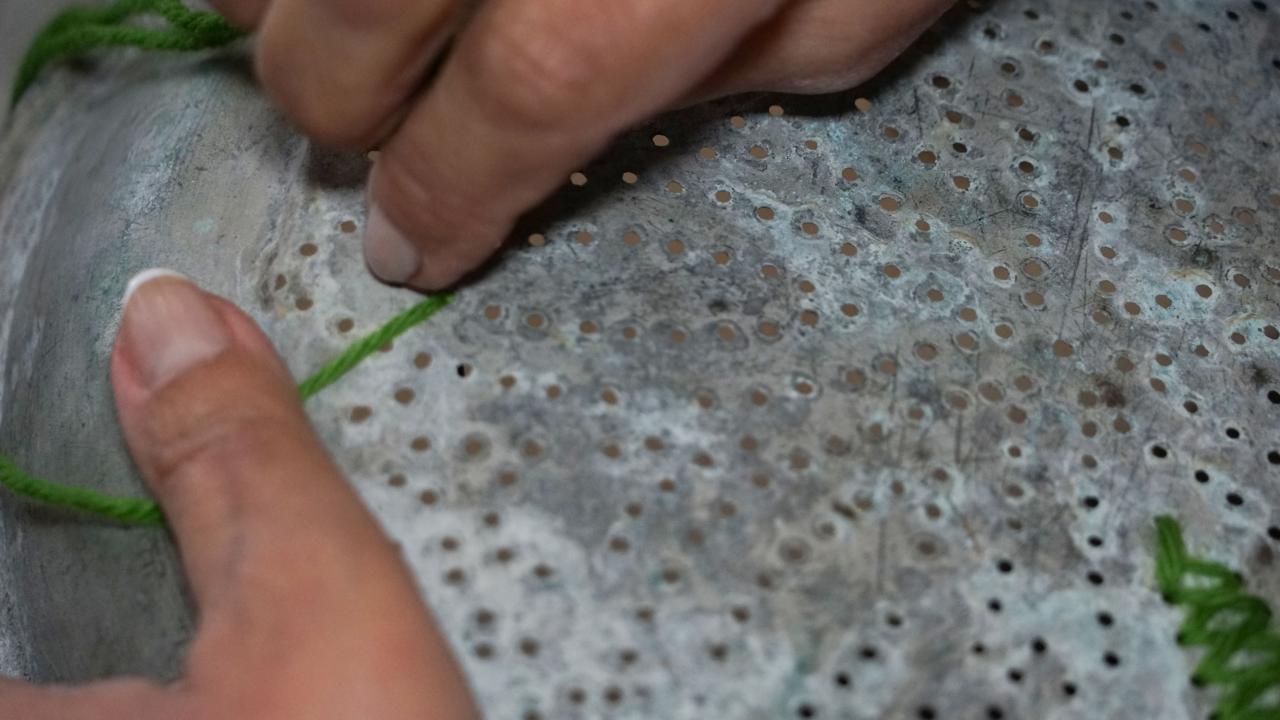 "Trabzon`dan, anneannemin çeyizinden gelen 2 bakır süzgecimiz vardı. Annem `Bunları atsak mı ne yapsak?` derken ben onları depoya getirdim. `Acaba üzerindeki deliklerden yararlanıp işleyebilir miyim?` diye düşündüm. 3 yıldır hayalimdi, depoda bekliyordu. Bu kış nihayet pandemide elime alabildim, denedim ve oldu. Anneannemden kalan bakır, makarna süzdüğümüz süzgeçler artık evlerimizi süsleyecek birer obje oldu. Çöpe atılmaktan da kurtuldu böylece."