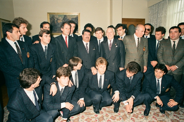 Eski Galatasaray Kulübü Başkanı Prof. Dr. Ali Tanrıyar, 103 yaşında tedavi gördüğü hastanede vefat etti. Dönemin Başbakanı Turgut Özal, 23 Mart 1989`da Galatasaray Kulüp Başkanı Tanrıyar ve futbolcuları kabulünde görülüyor. Galatasaray Teknik Direktörü Mustafa Denizli (ayakta sol 3).