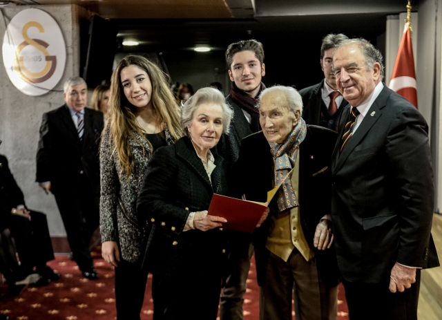 Eski Galatasaray Kulübü Başkanı Prof. Dr. Ali Tanrıyar, 103 yaşında tedavi gördüğü hastanede vefat etti. 25 Mayıs 2017`de Galatasaray Kulübü Divan Kurulu Olağanüstü toplantısında efsane başkanlardan Tanrıyar (ortada), eşi Selma Tanrıyar`a (solda) divan kurulu üyelik beratını takdim ederken görülüyor.