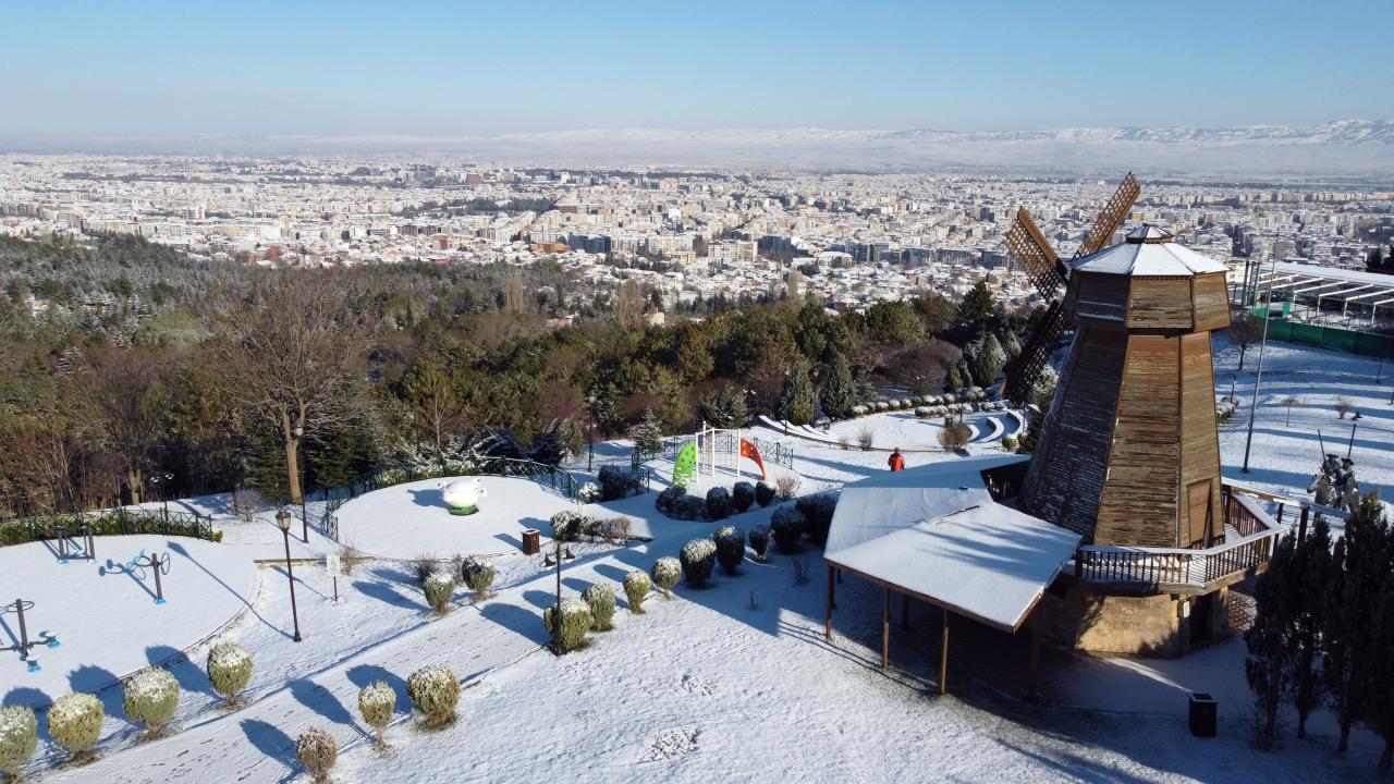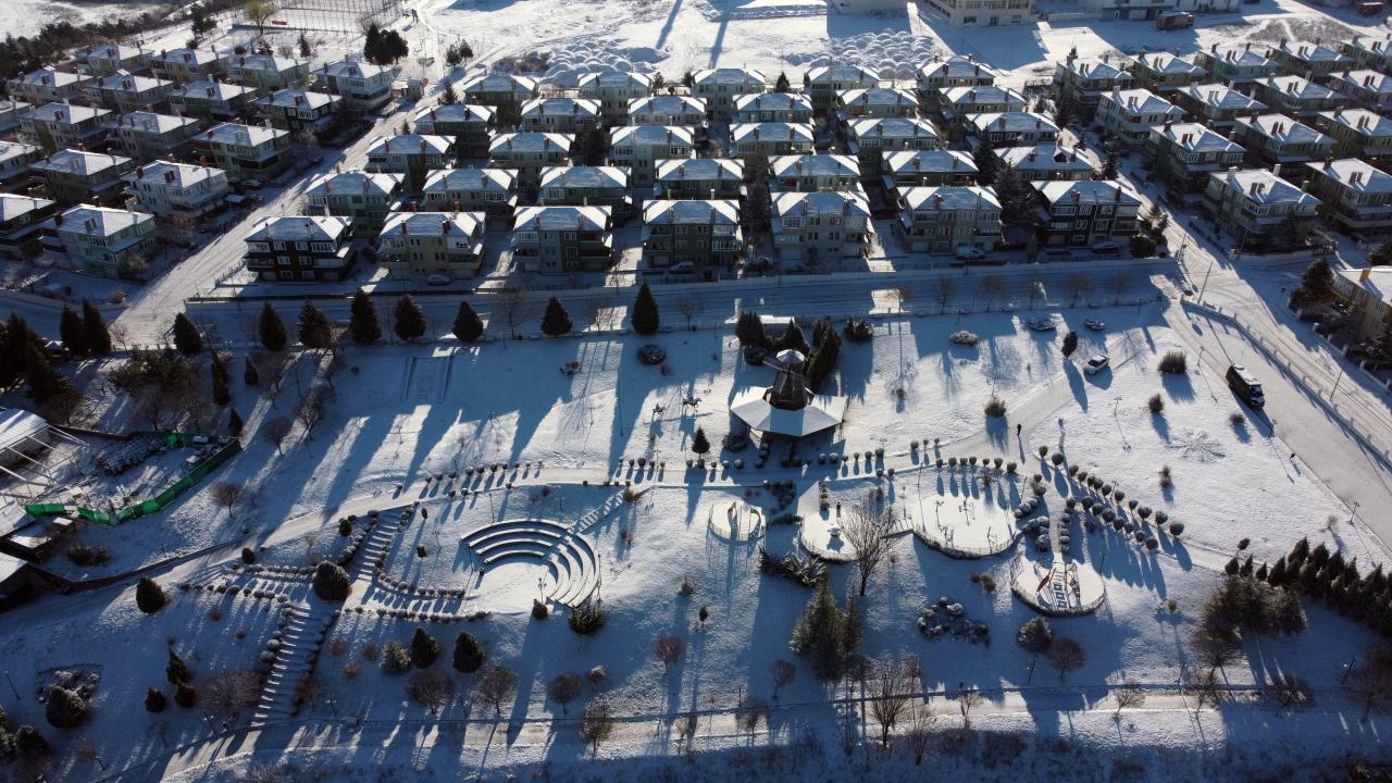 Eskişehir'de kar, kent merkezinde beyaz örtü oluşturdu. Odunpazarı ilçesi Çankaya Mahallesi'ndeki Don Kişot temalı Şelale Park'ın karlı manzaraları dronla görüntülendi.