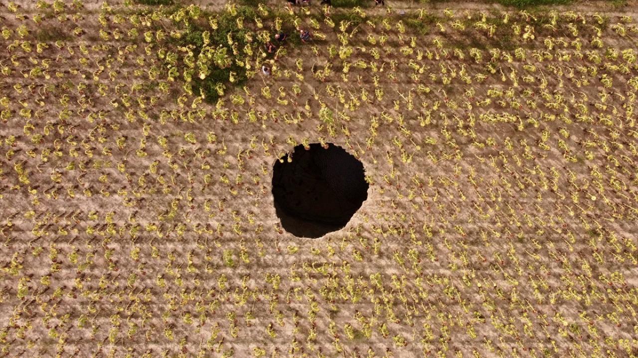 Tarla sahibi, yaklaşık 20 metre derinliğinde ve 5 metre çapındaki obruğa ilişkin yetkililere bilgi verdi.