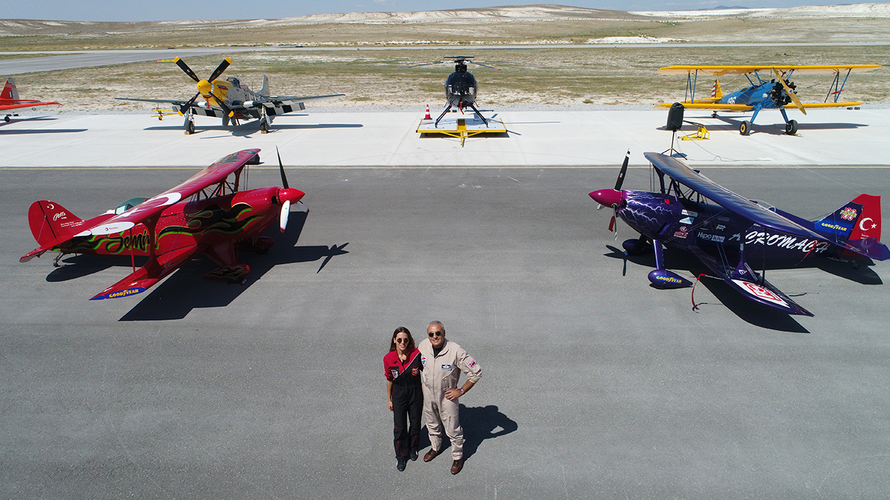 Türkiye`nin ilk profesyonel akrobasi pilotu Ali İsmet Öztürk, "Mor Menekşe" adlı uçağıyla, Türkiye`nin tek sivil kadın akrobasi pilotu kızı Semin Öztürk Şener de kırmızı renkli "Pitts S2-B" uçağıyla gökyüzünü renklendirecek.