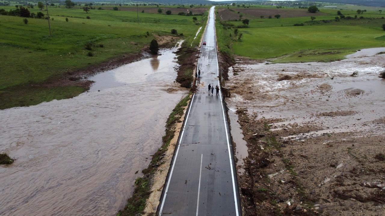 Seyitgazi-Yazılıkaya kara yolu taşkın nedeniyle suyun getirdiği toprak ve ağaç dallarıyla kapandı. İş makineleri yolun ulaşıma açılması için çalışma yapıyor.
