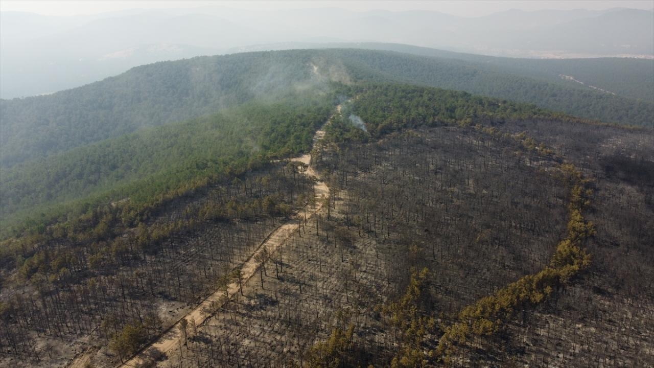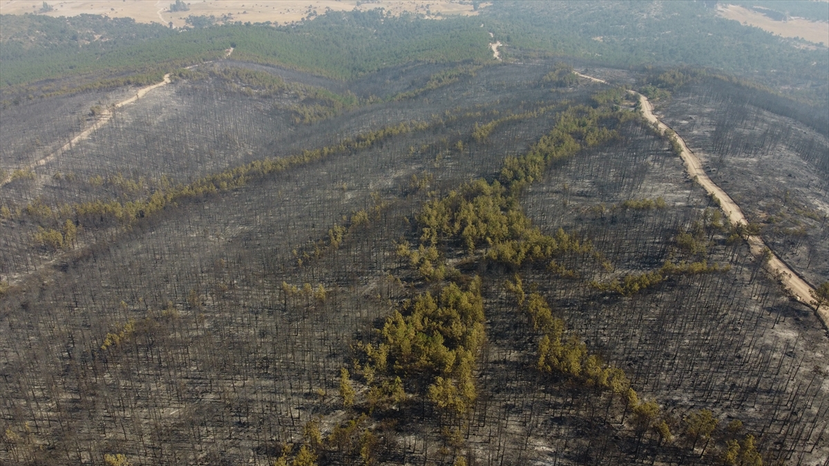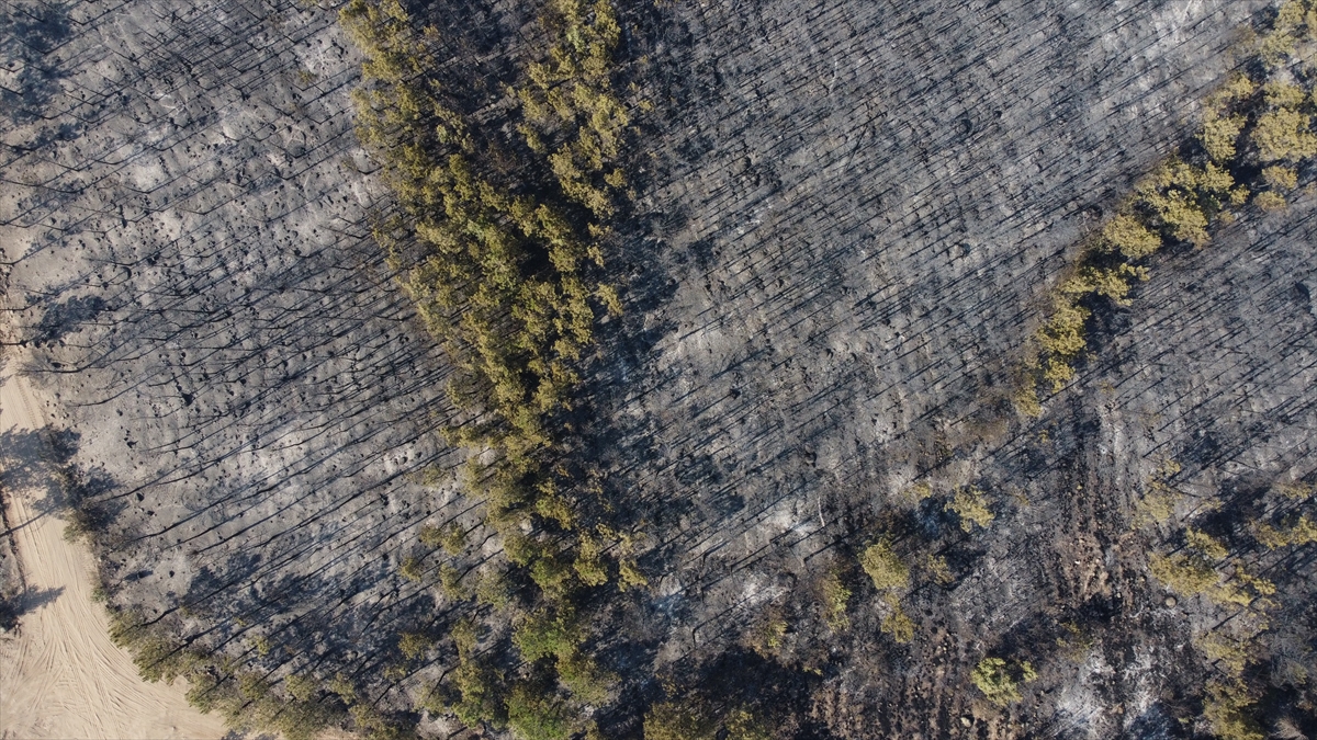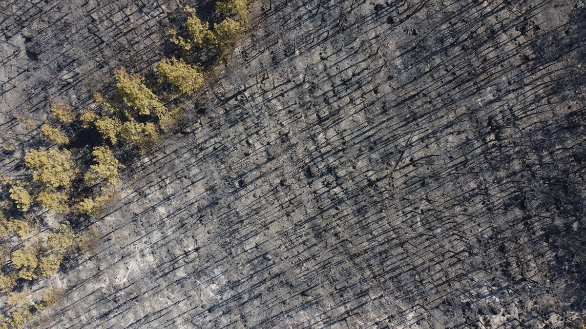 Yangın nedeniyle zarar gören ormanlık alan, dronla görüntülendi.
