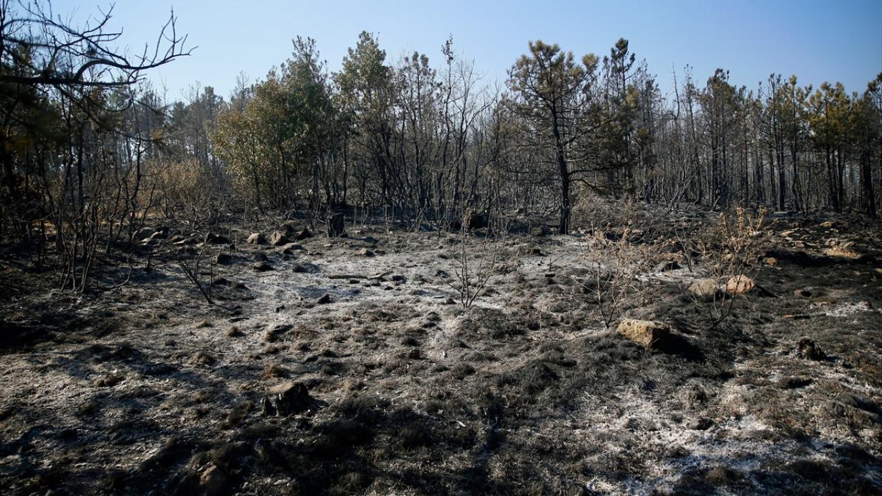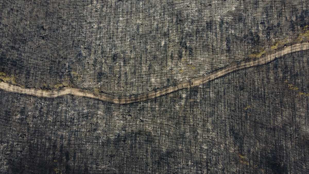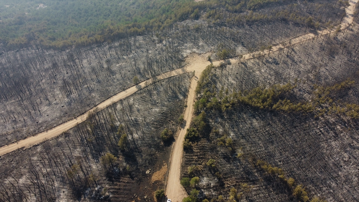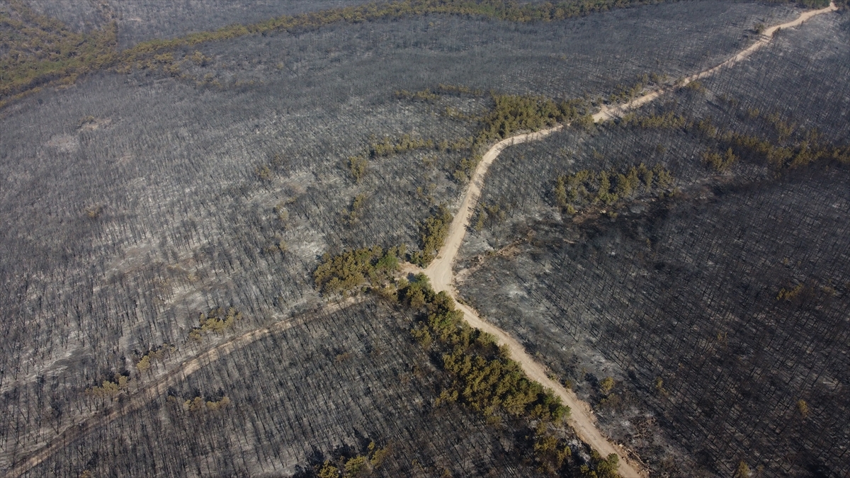 Yangın nedeniyle zarar gören ormanlık alan, dronla görüntülendi.