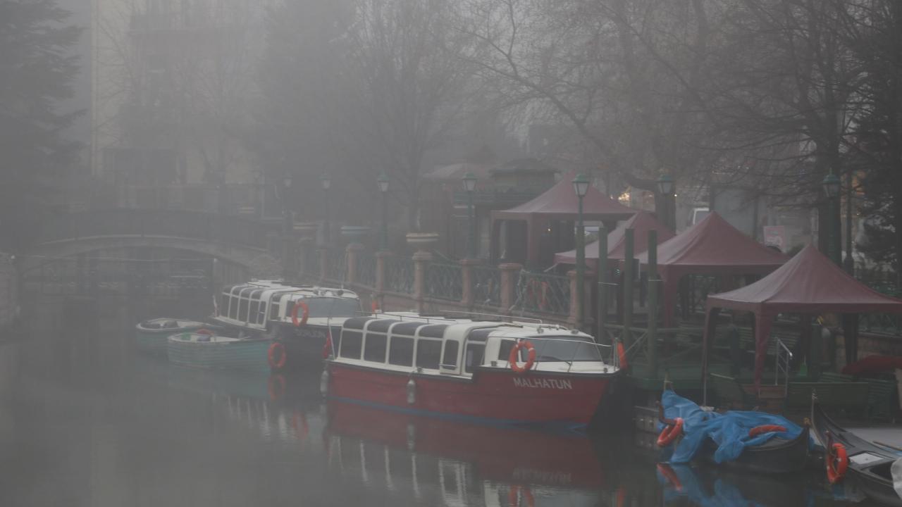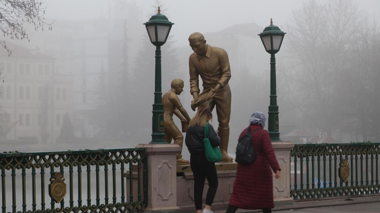 Şehrin ortasından geçen Porsuk Çayı`ndaki tekneler ve çevresinde bulunan heykeller sisin arasında kayboldu.