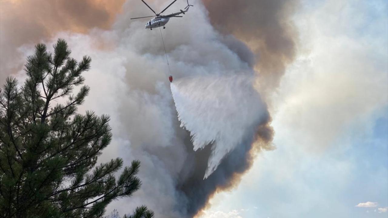 Helikopterlerle yangın bölgesindeki 2 riskli noktaya su bırakıldığı bildirildi.