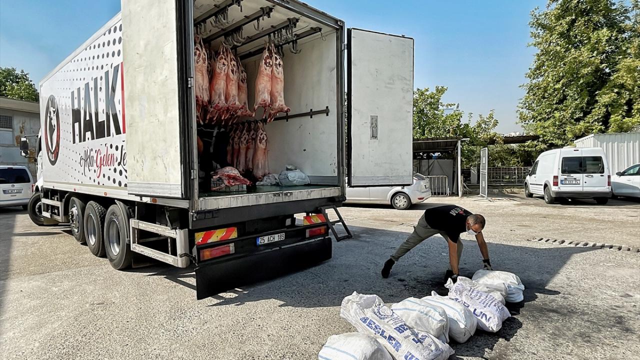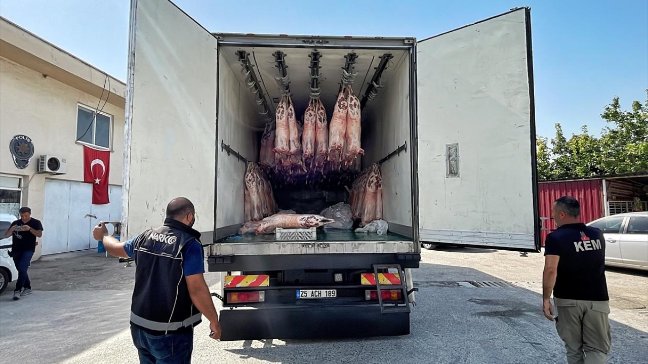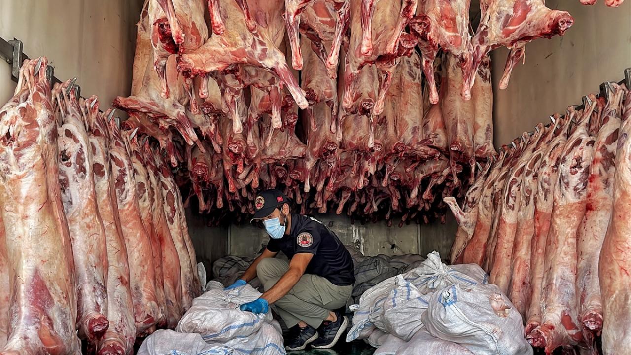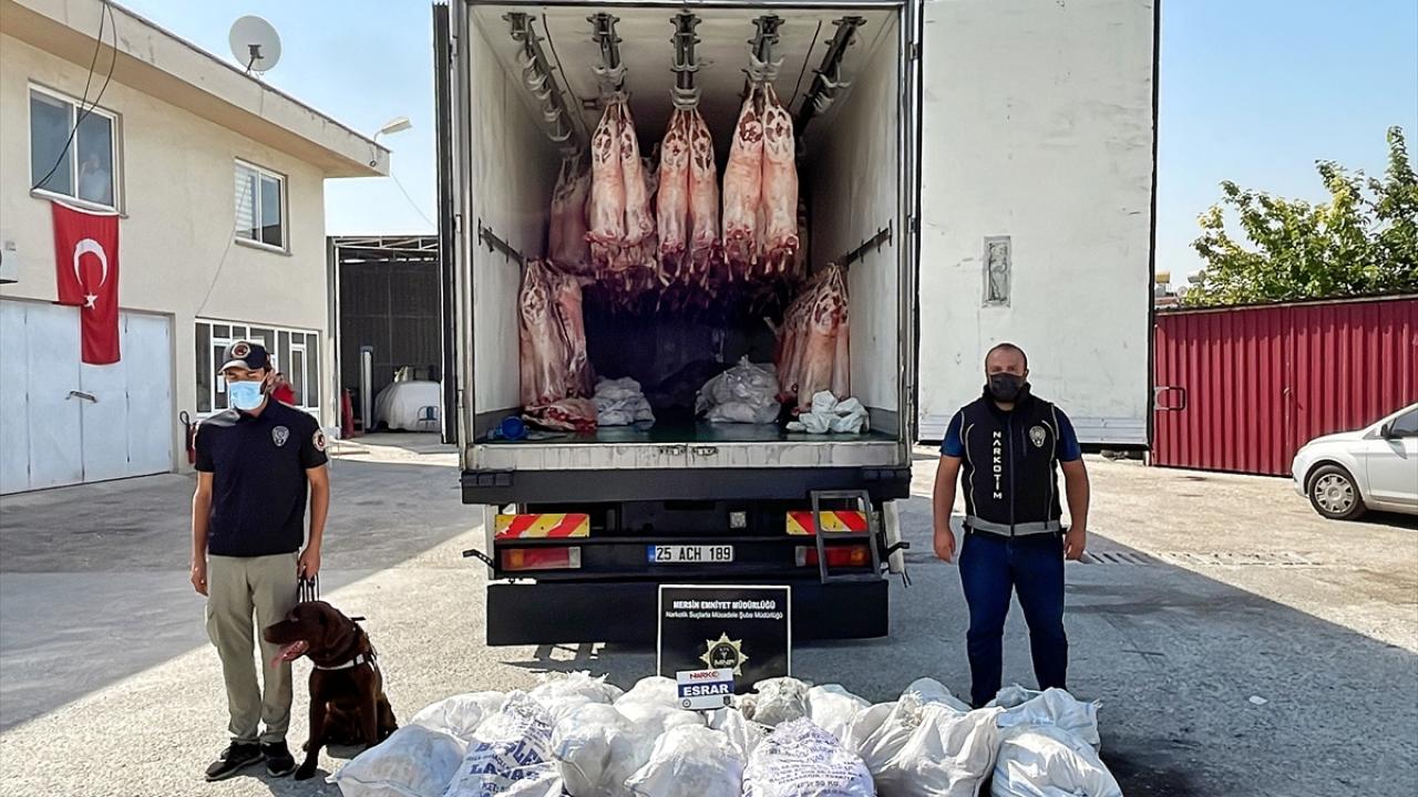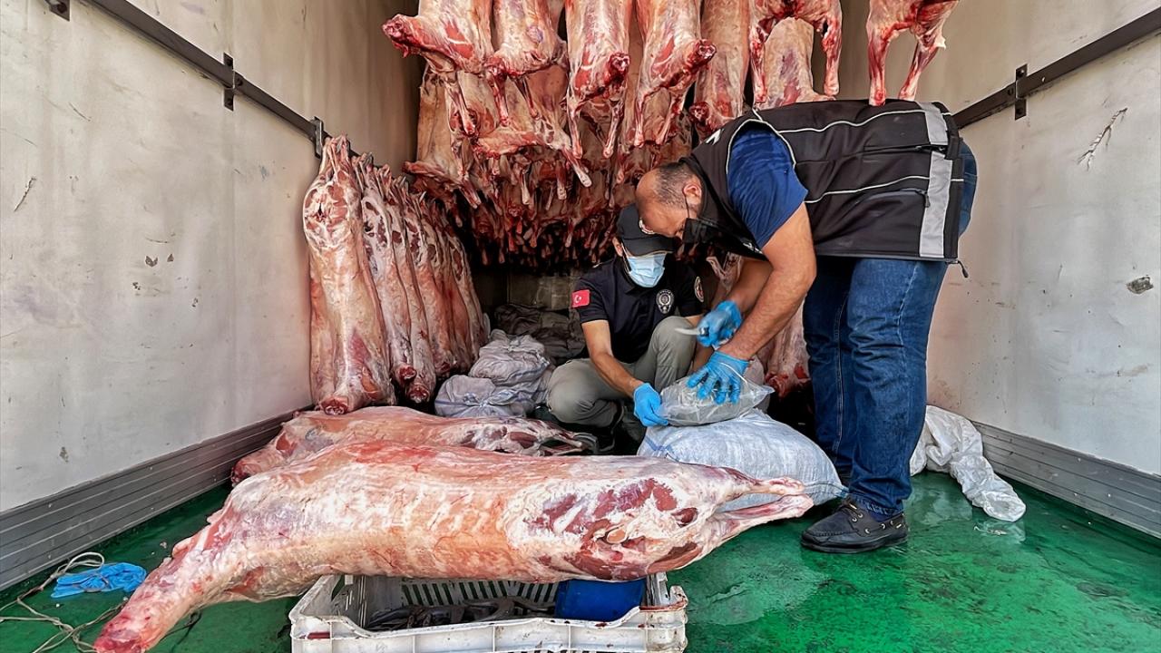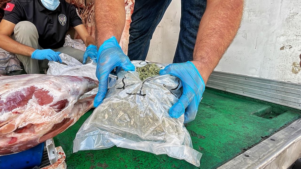 Öte yandan, kamyonun karadan ve havadan takibe alındığı operasyon kameraya yansıdı. Aracın durdurulması, sürücünün yakalanması, narkotik dedektör köpeğiyle kamyonda arama yapılması ve karkas etlerin arasında çuvallardaki esrar bulunması görüntülendi.