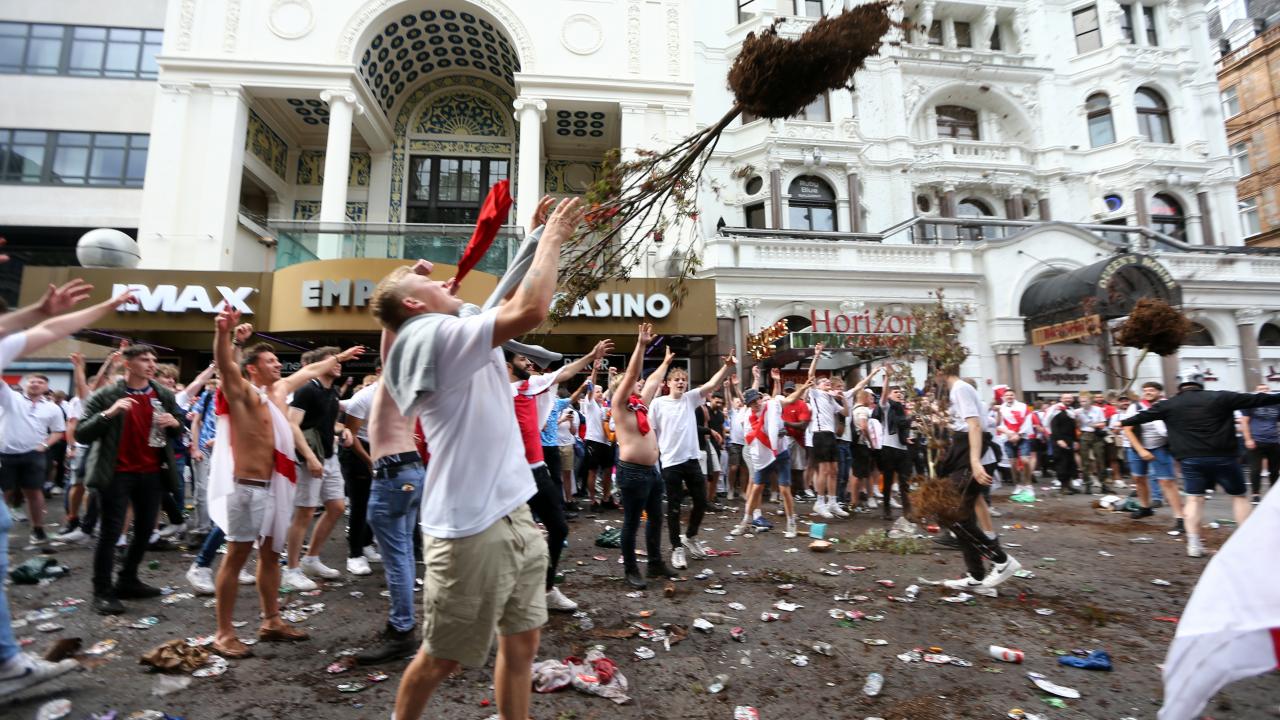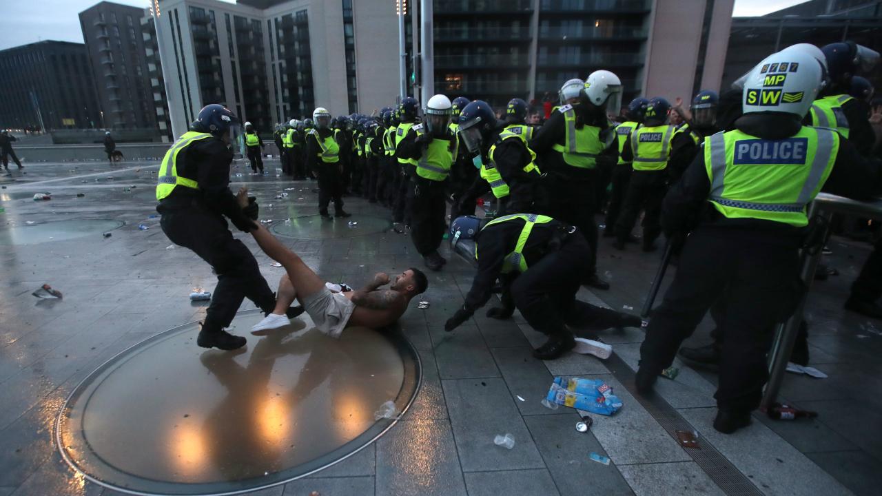 İngiliz polisi, şehir merkezindeki meydanda toplanan ve taşkınlık yapan kalabalığa müdahale etti, en az 2 kişiyi gözaltına aldı.