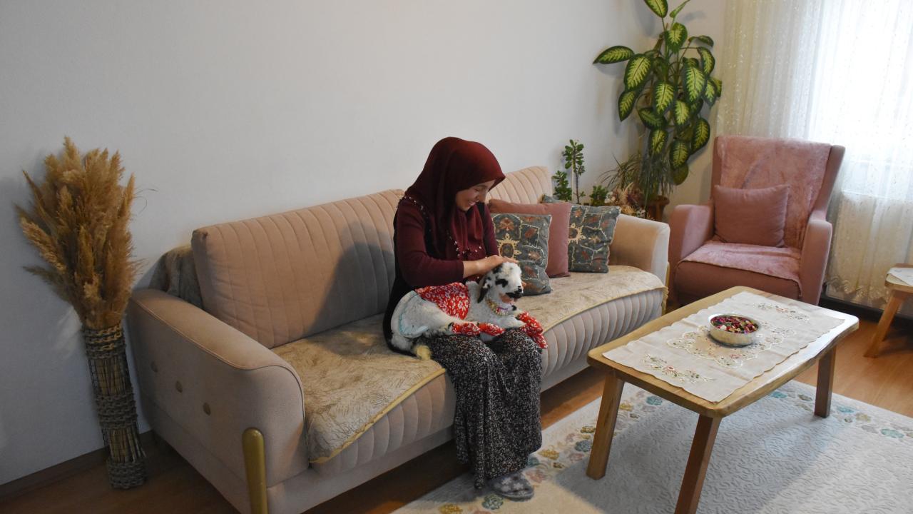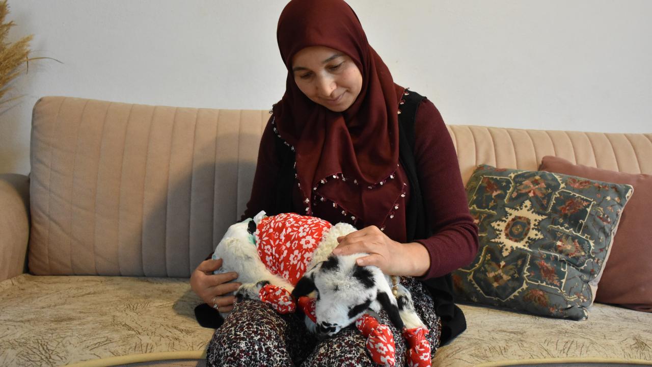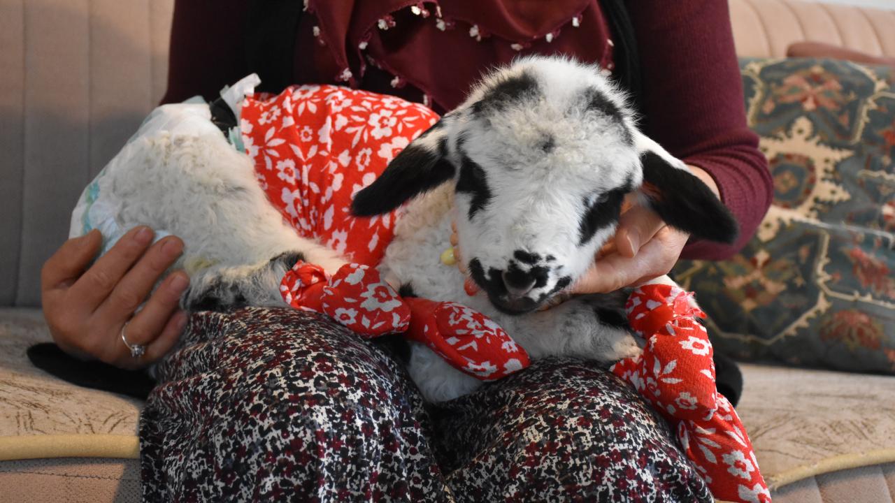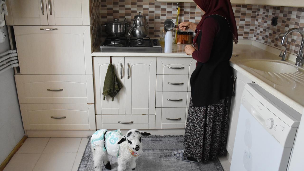 İki çocuk annesi Yasemin Koç, biberonla beslediği kuzuyu sokağa çıkartacağı zaman kazak ve çorap giydiriyor.