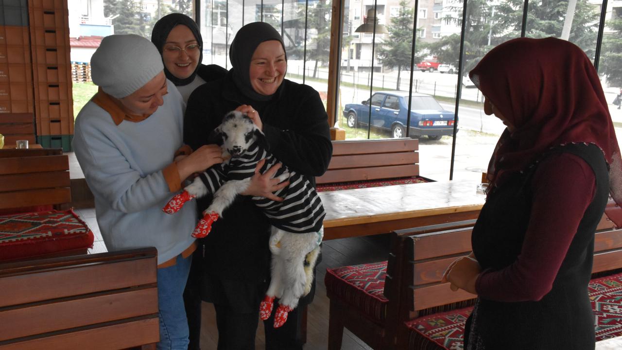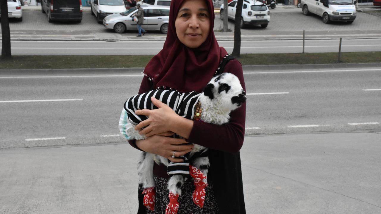 Yasemin Koç`un mahallede gezdirdiği, alışverişe gittiği kuzuya vatandaşlar ilgi gösteriyor, fotoğraf çektiriyor.