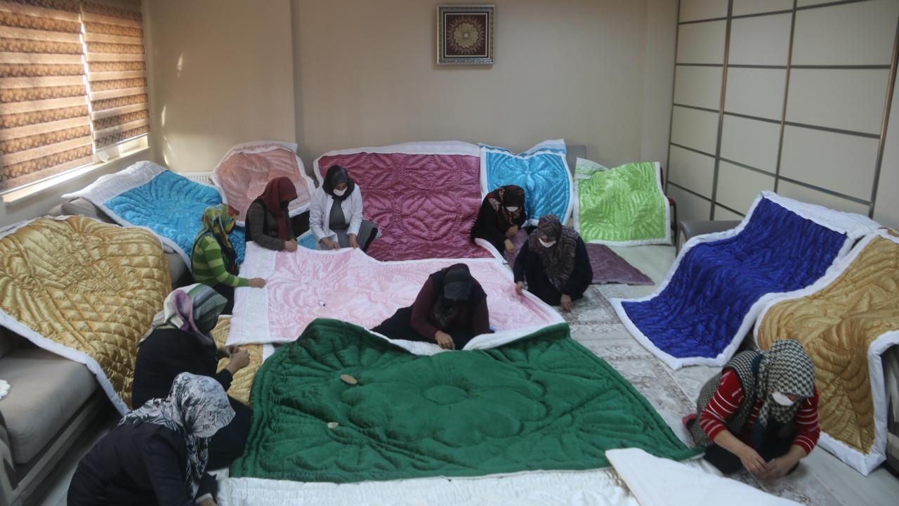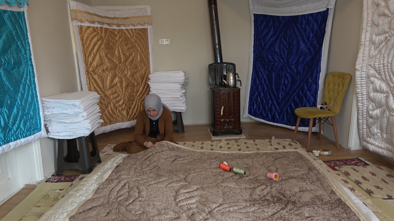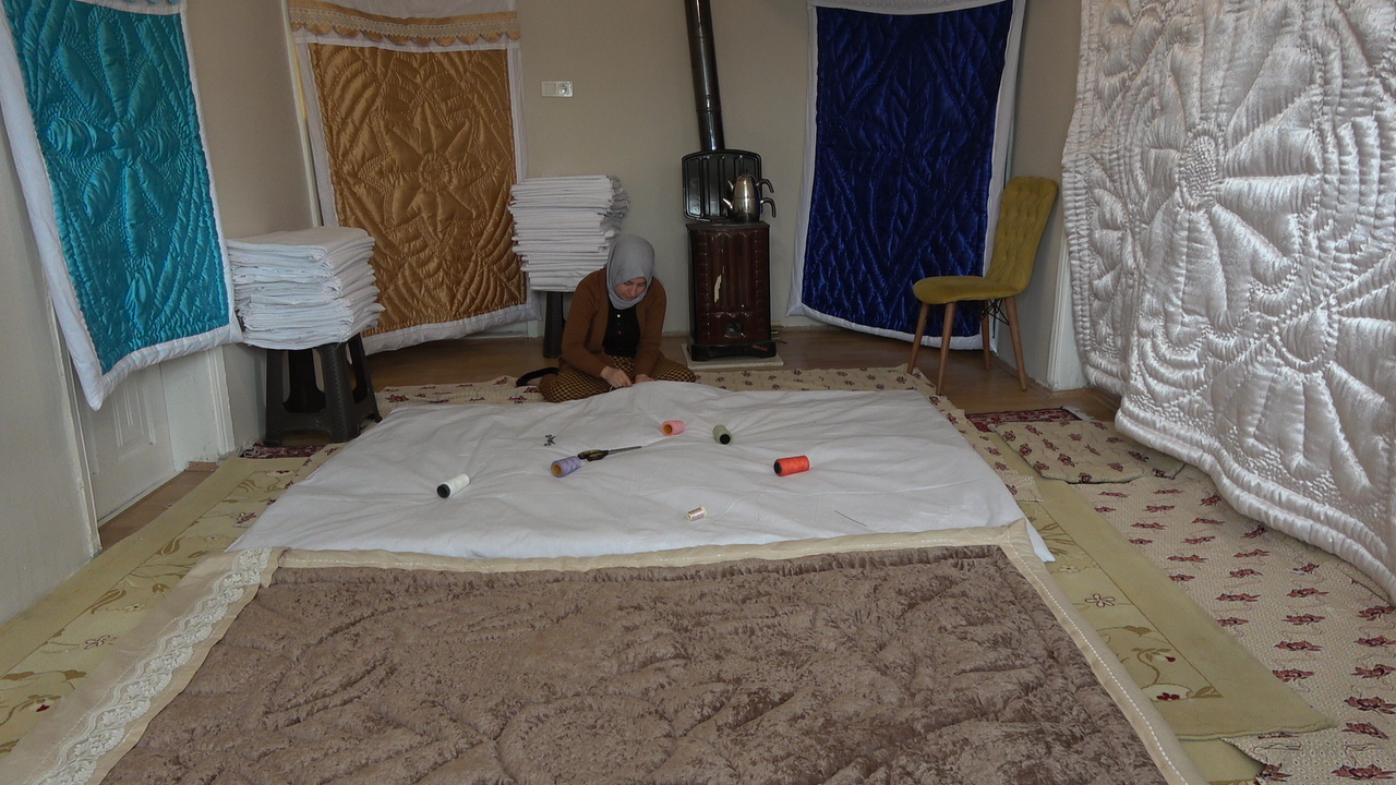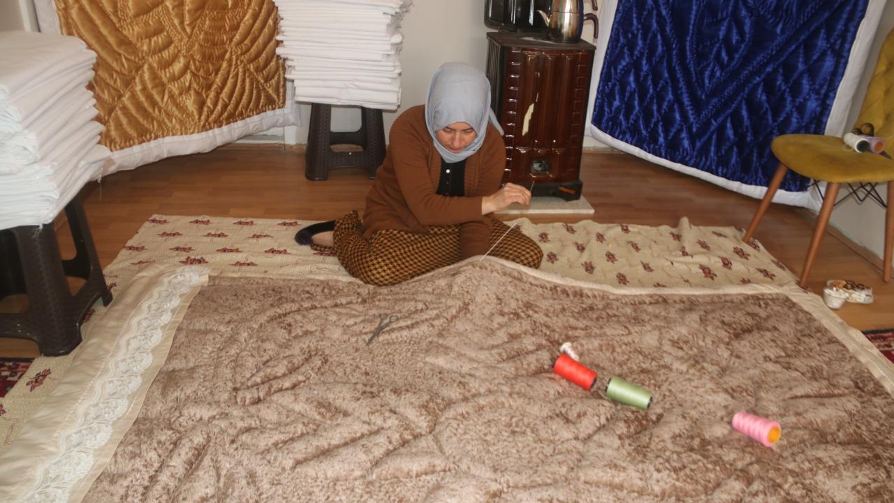 Kursta aldığı eğitimle atölyeye dönüştürdüğü evinde işlediği yorganlarla kızların çeyizini hazırlayan Nesrin Or, aile bütçesine katkı sağlıyor. Yorganlarında çeşit çeşit desenleri işleyen Or, birçok ilden de sipariş alıyor.
