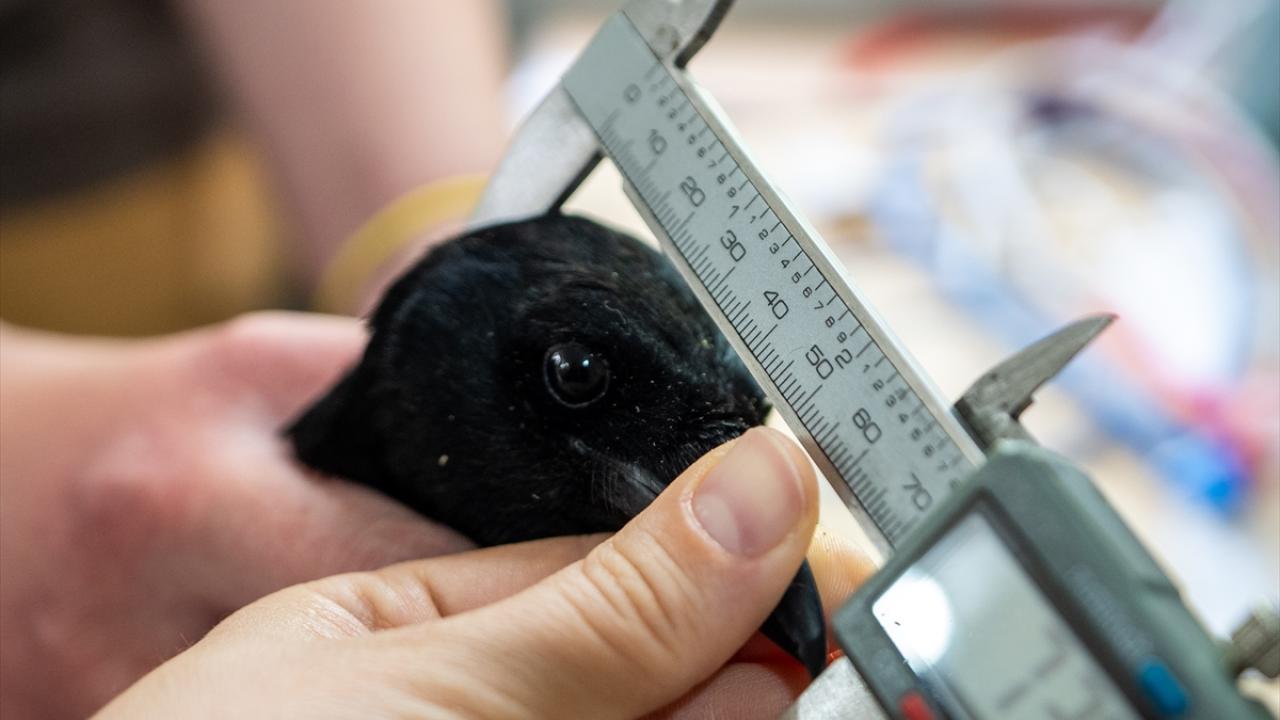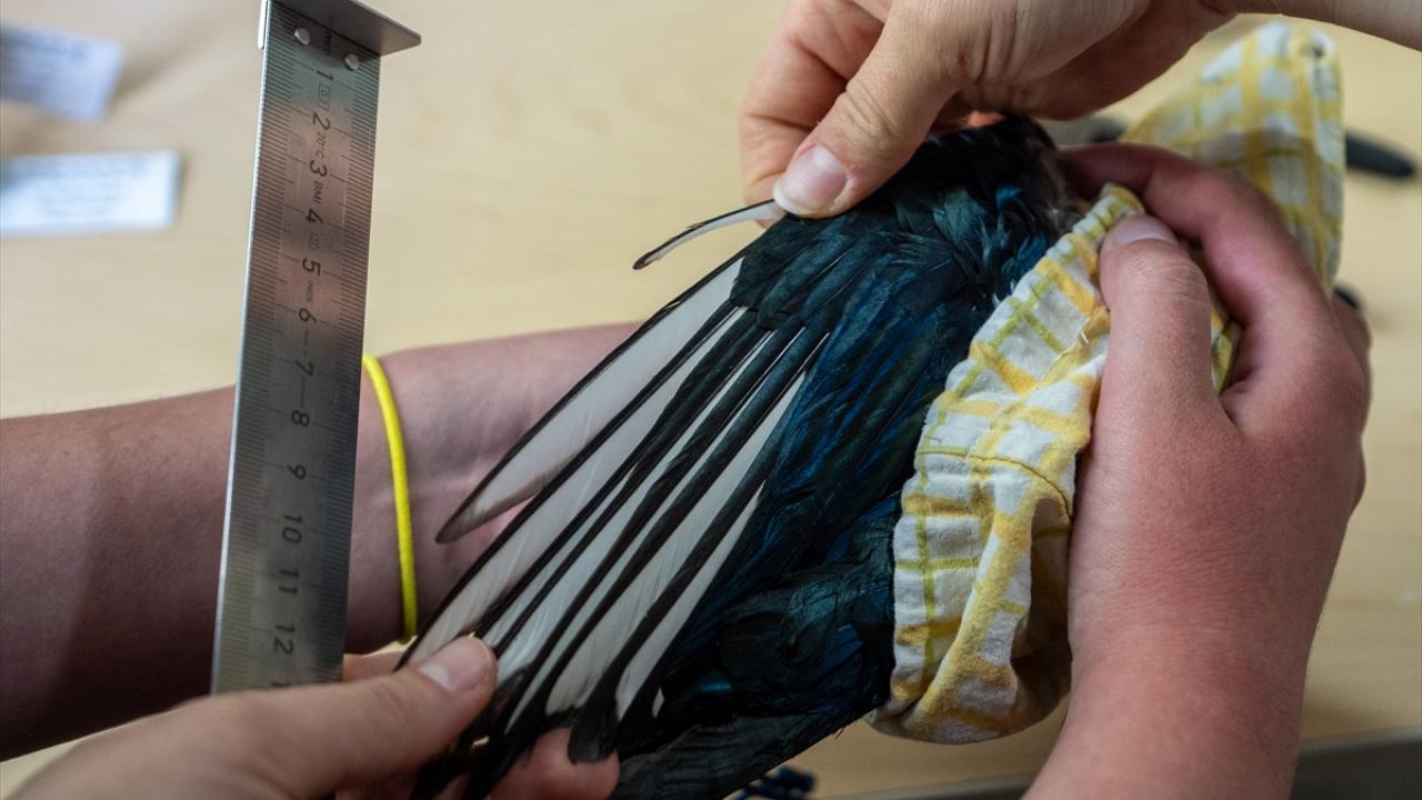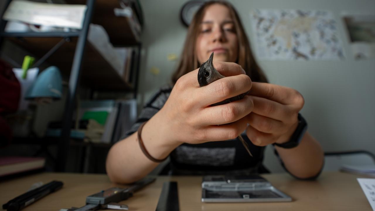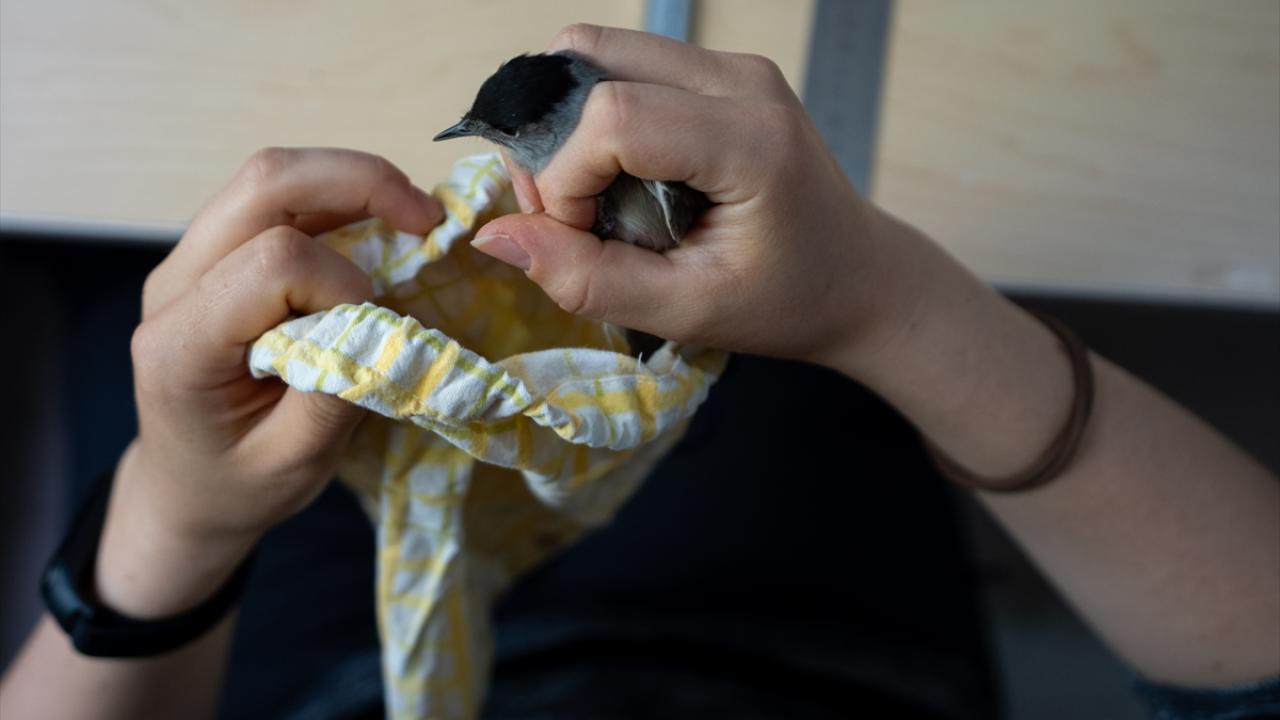 Araştırmacılar, halkalama işlemi yapılacak kuşları inceleyerek sağlık ve gelişimlerini kontrol ediyor.