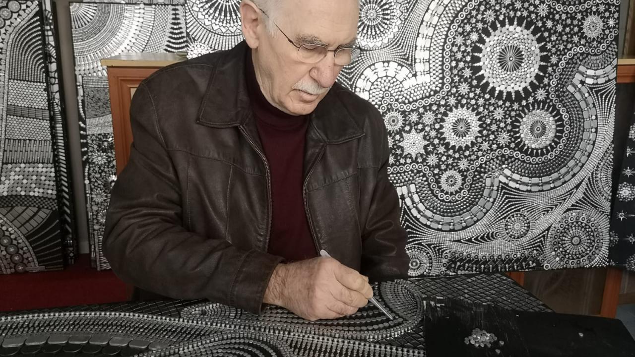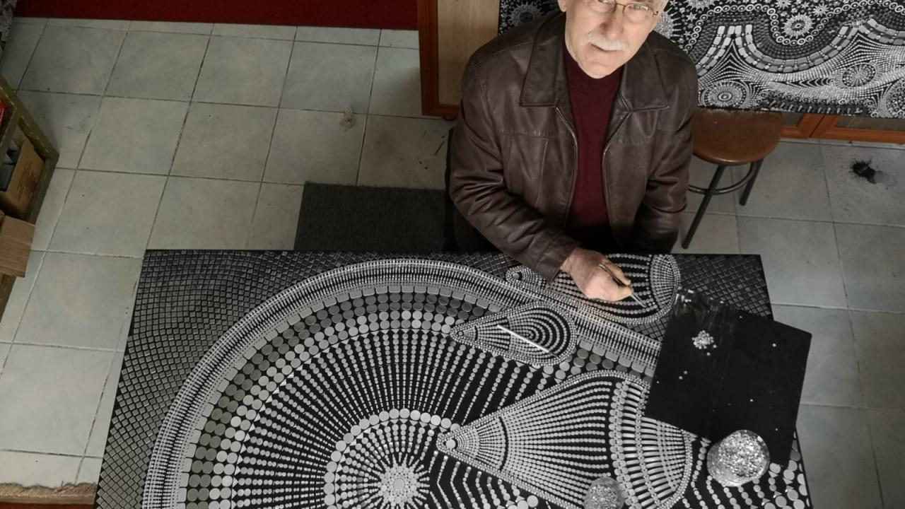 Aşoğlu`nun atölyesi ve sabır ürünü tabloları öğrenciler, akademisyenler ve sanatseverlerden ilgi görüyor.