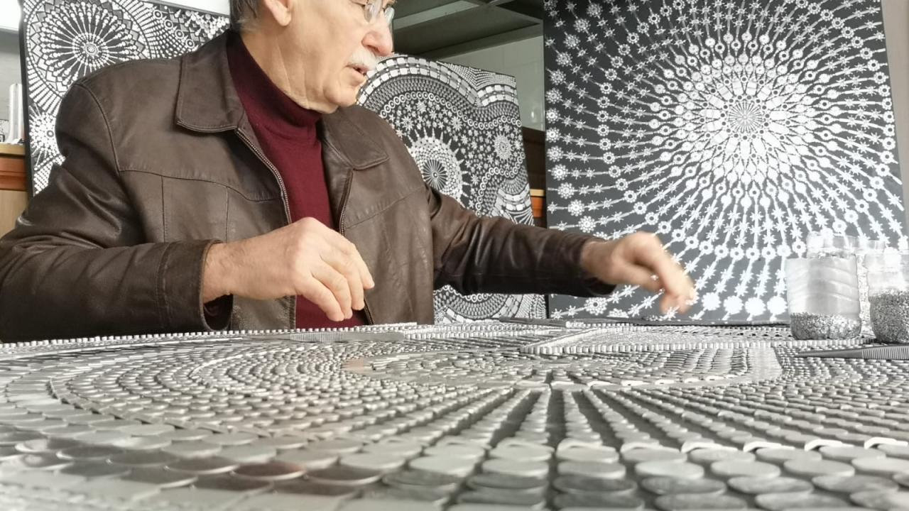 Yaklaşık 4 yıldır metal üretimi yapılan fabrikalardaki pres atıklarıyla sanat eserleri yapan emekli öğretmen, binlerce metal parçayı birleştirerek çok sayıda tablo yaptı.