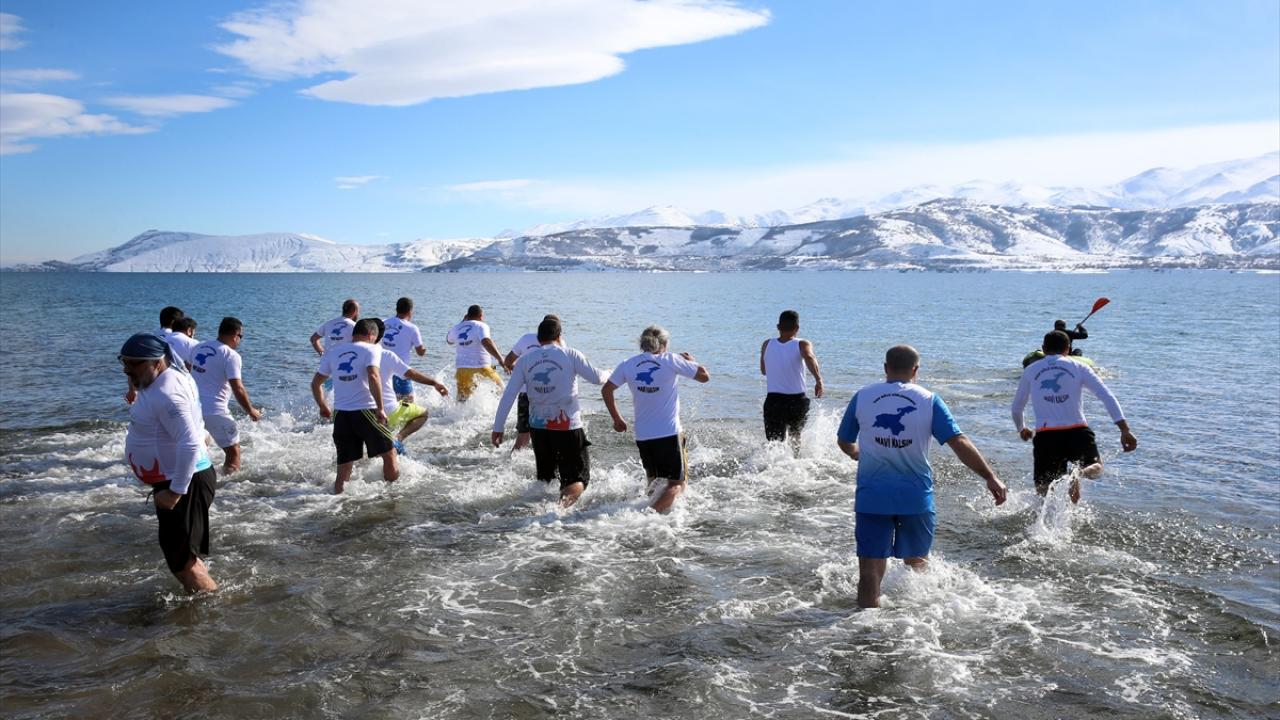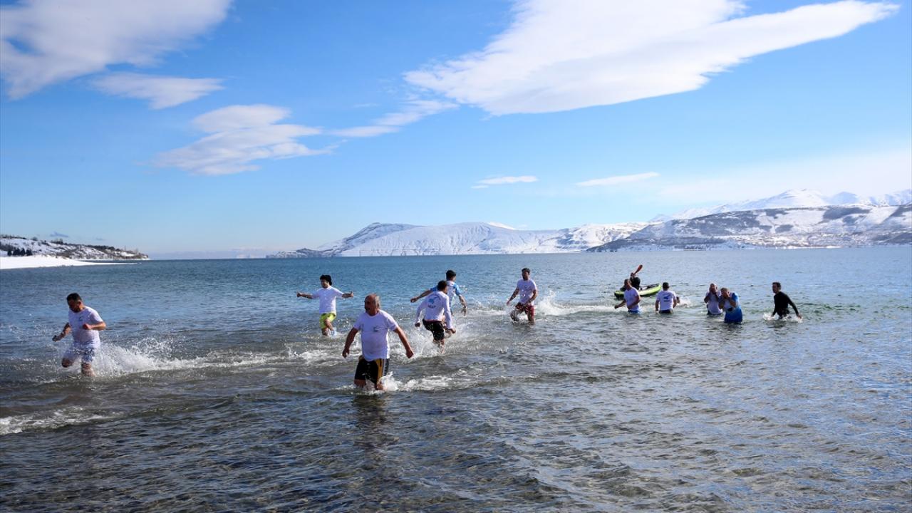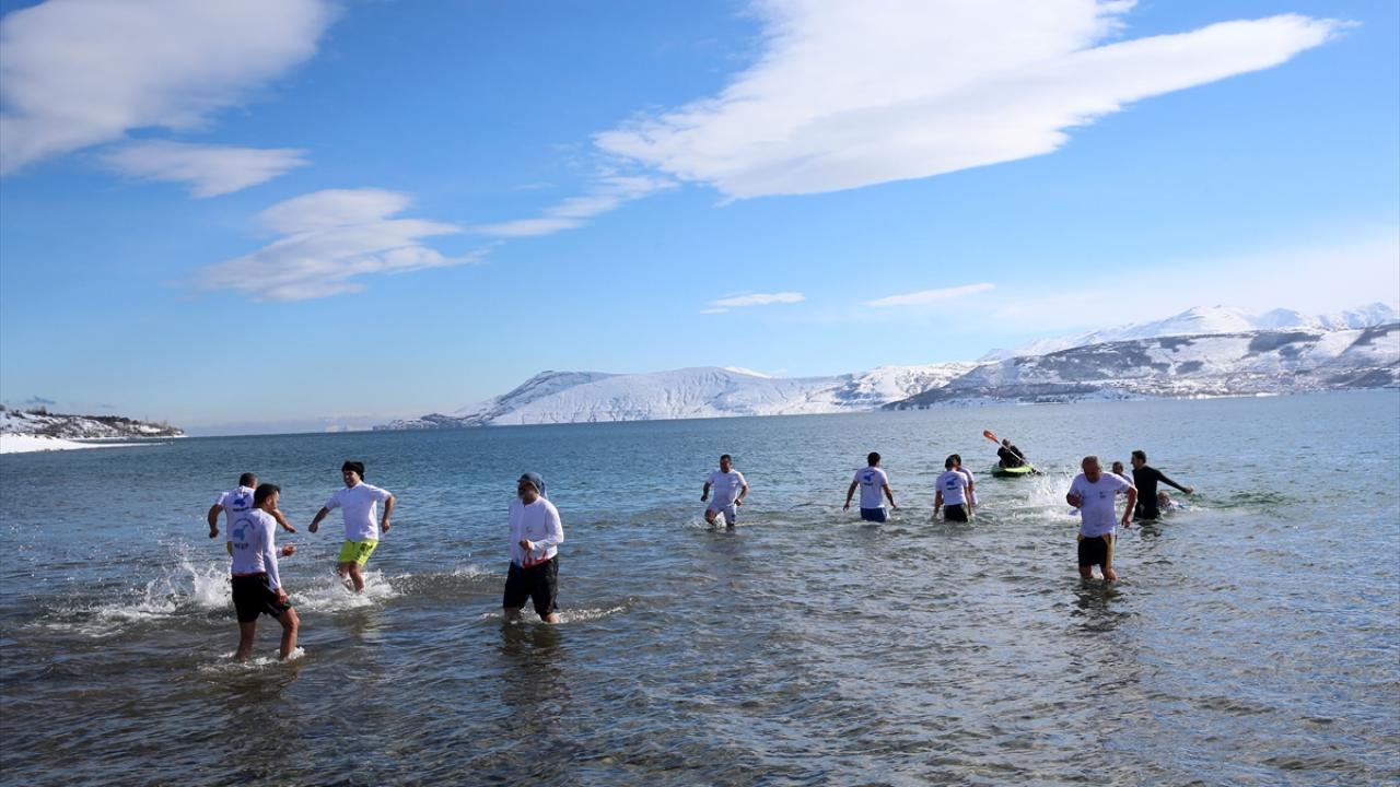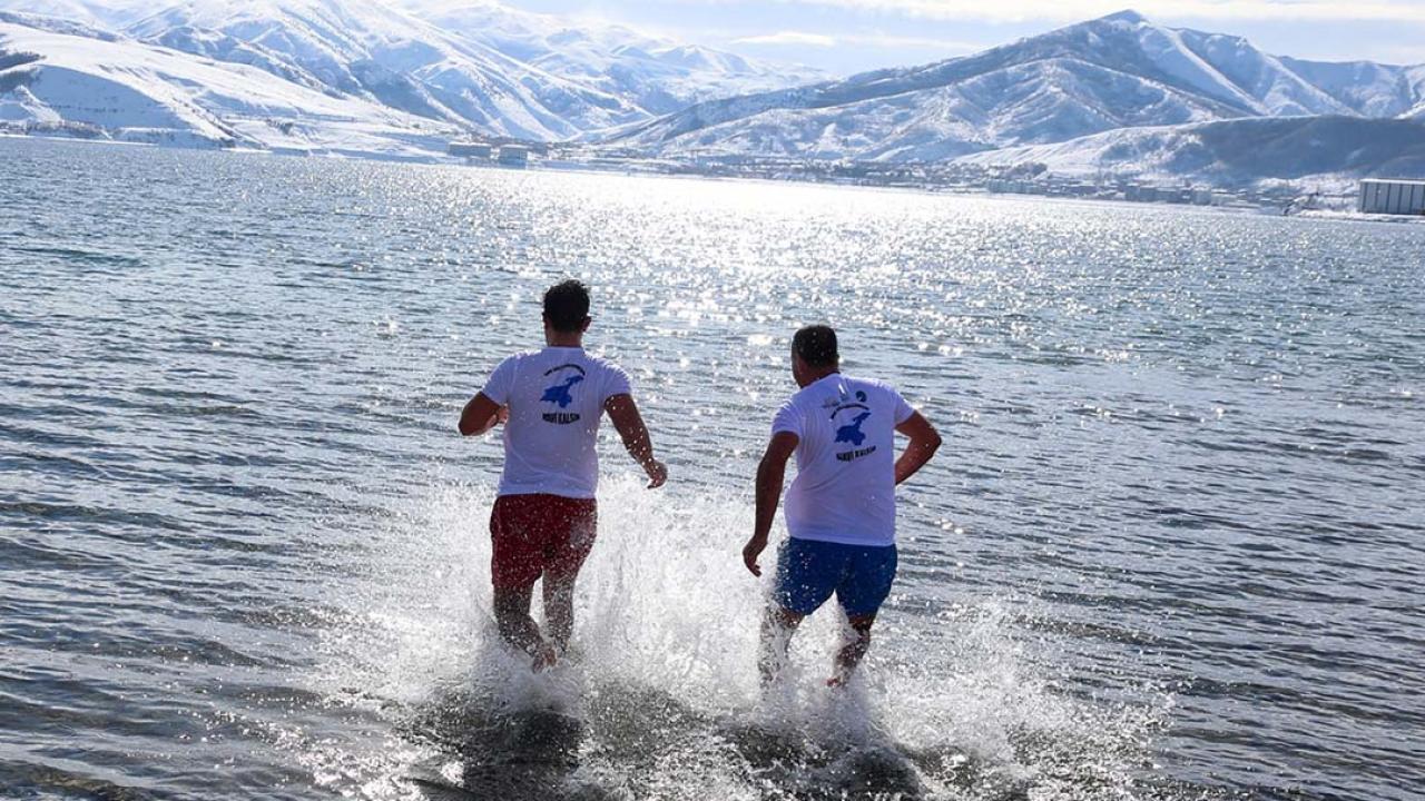 Van Gölü Aktivistileri Derneği üyeleri, Van Gölü havzasının tarihi ve doğal güzelliklerine dikkat çekmek amacıyla dondurucu soğukta yüzme etkinliği düzenledi.